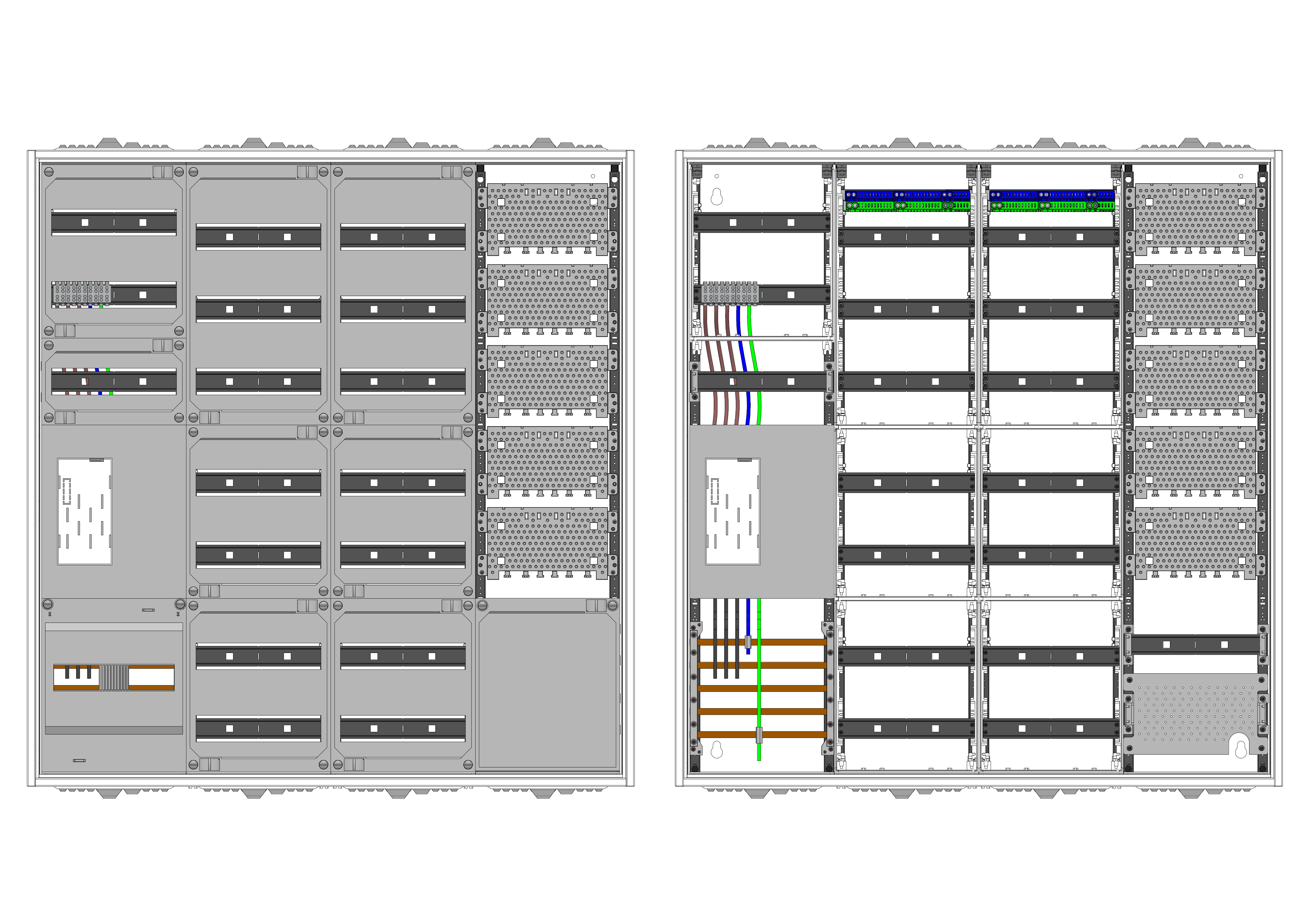 AEZ42-230-004, eHZ-Zählerverteilung nach VDE 0603, DIN43870, 4100:2019-04 für den Innenbereich für Wandbefestigung AP/UP, Fabr. Alphatec, BxHxT [mm] = 1050x1100x230, Schutzklasse II, IP54, RAL 7035, Bestehend aus: Gehäuse, Doppeltür mit Schwenkhebel für Profilhalbzylinder, Flansche SF45 (oben) und SF41 (unten) und Berührungsschutzabdeckungen, aufgebaut wie folgt: 1x Zählerplatz, 1x TSG-Platte, 7x Hutschienen in Verteilerfeld 1 (12TE), 7x Hutschienen in Verteilerfeld 2 (12TE), 1x Medienfeld 1 Feld breit inkl. APZ, geeignet für TSG-Hutschienenmontage: ja, inkl. Querverdrahtung, komplett zusammengebaut und verdrahtet gemäß VNB.0001
