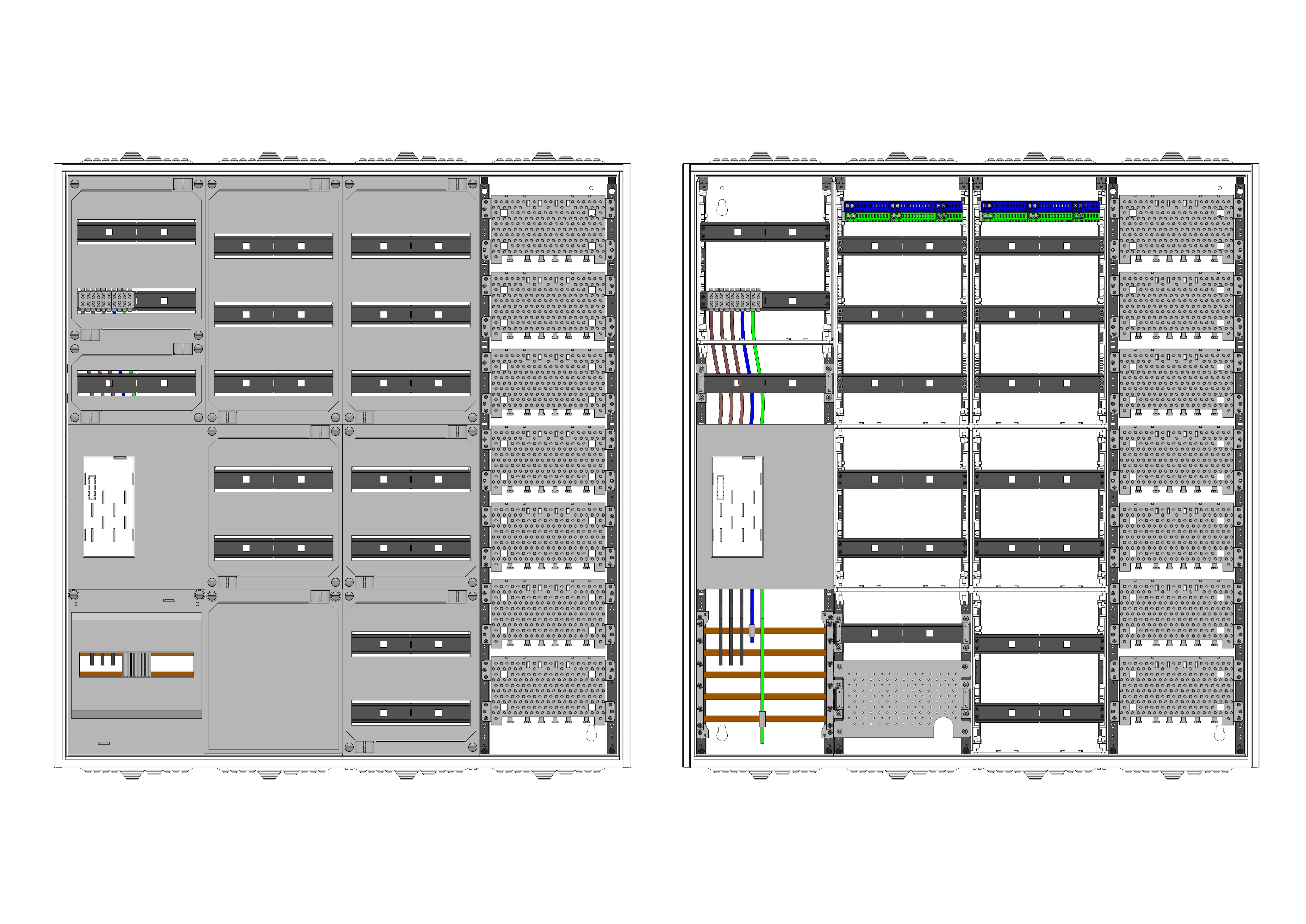 AEZ42-230-011, eHZ-Zählerverteilung nach VDE 0603, DIN43870, 4100:2019-04 für den Innenbereich für Wandbefestigung AP/UP, Fabr. Alphatec, BxHxT [mm] = 1050x1100x230, Schutzklasse II, IP54, RAL 7035, Bestehend aus: Gehäuse, Doppeltür mit Schwenkhebel für Profilhalbzylinder, Flansche SF45 (oben) und SF41 (unten) und Berührungsschutzabdeckungen, aufgebaut wie folgt: 1x Zählerplatz, 5x Hutschienen in Verteilerfeld 1 (12TE), 1x APZ in Verteilerfeld 1, 7x Hutschienen in Verteilerfeld 2 (12TE), 1x Medienfeld 1 Feld breit, komplett zusammengebaut und verdrahtet gemäß VNB.0001