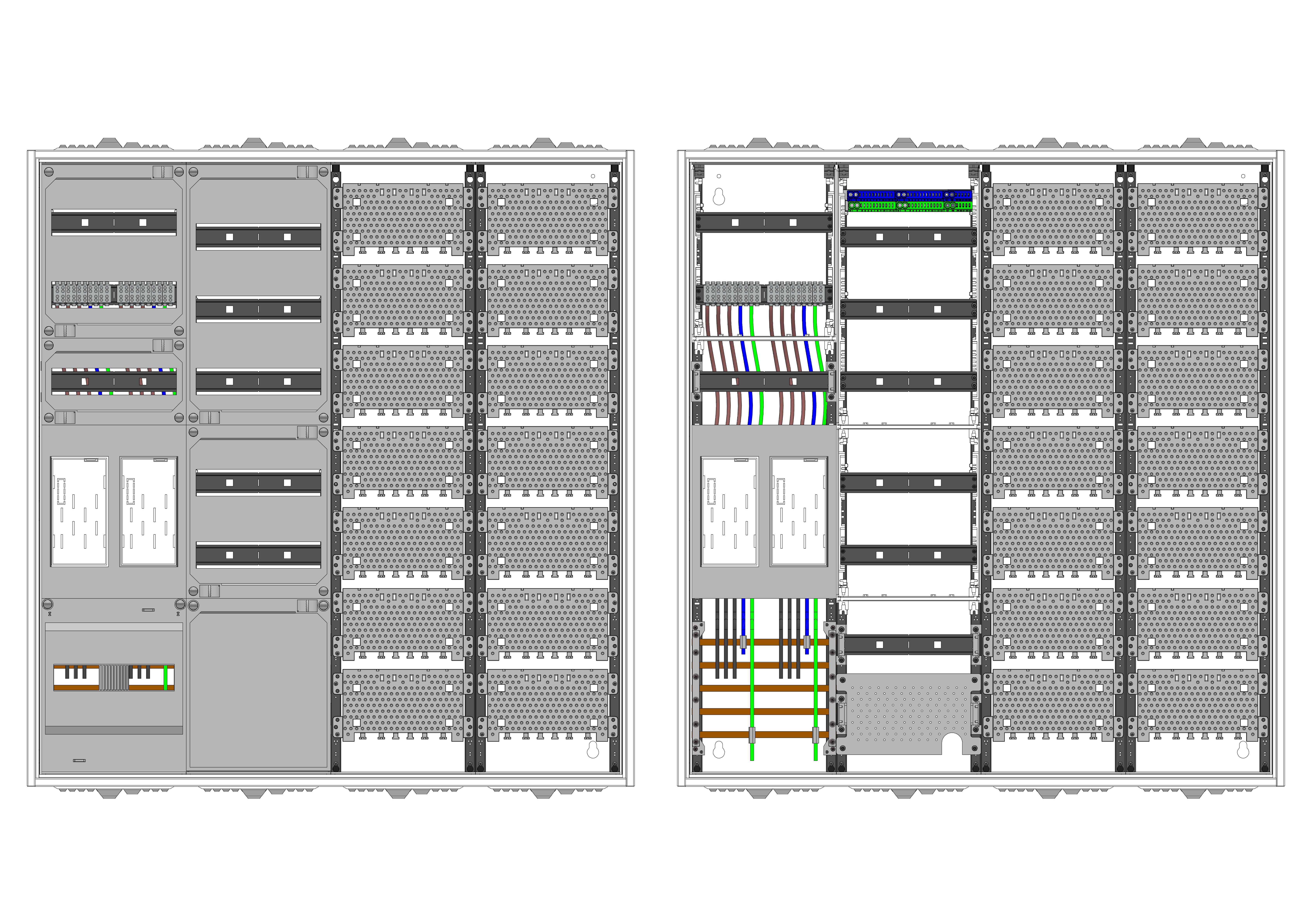 AEZ42-230-013, eHZ-Zählerverteilung nach VDE 0603, DIN43870, 4100:2019-04 für den Innenbereich für Wandbefestigung AP/UP, Fabr. Alphatec, BxHxT [mm] = 1050x1100x230, Schutzklasse II, IP54, RAL 7035, Bestehend aus: Gehäuse, Doppeltür mit Schwenkhebel für Profilhalbzylinder, Flansche SF45 (oben) und SF41 (unten) und Berührungsschutzabdeckungen, aufgebaut wie folgt: 2x Zählerplatz, 5x Hutschienen in Verteilerfeld 1 (12TE), 1x APZ in Verteilerfeld 1, 1x Medienfeld 2 Feld breit, komplett zusammengebaut und verdrahtet gemäß VNB.0001
