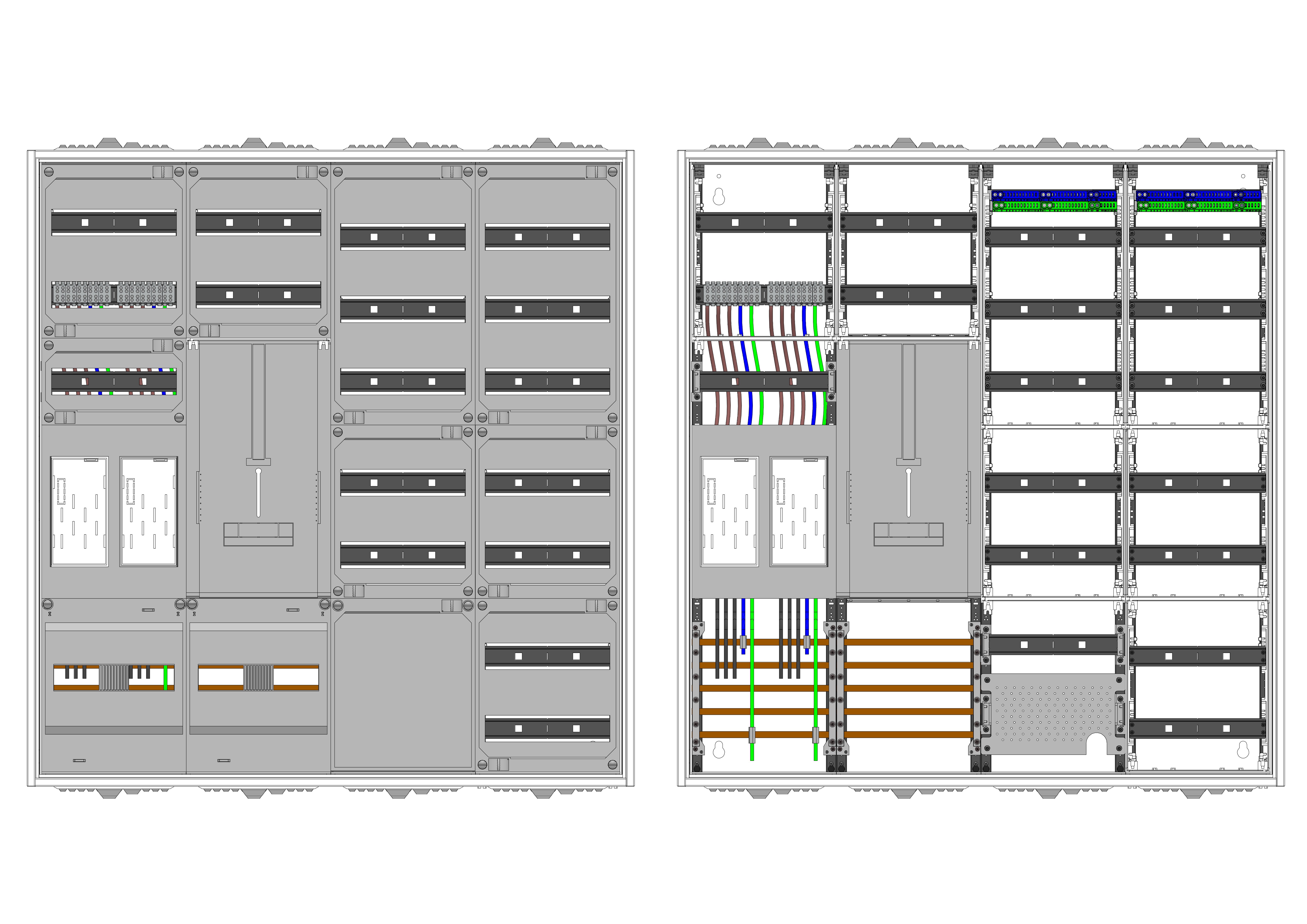AEZ42-230-027, eHZ-Zählerverteilung nach VDE 0603, DIN43870, 4100:2019-04 für den Innenbereich für Wandbefestigung AP/UP, Fabr. Alphatec, BxHxT [mm] = 1050x1100x230, Schutzklasse II, IP54, RAL 7035, Bestehend aus: Gehäuse, Doppeltür mit Schwenkhebel für Profilhalbzylinder, Flansche SF45 (oben) und SF41 (unten) und Berührungsschutzabdeckungen, aufgebaut wie folgt: 2x Zählerplatz, 1x TSG-Platte, 5x Hutschienen in Verteilerfeld 1 (12TE), 1x APZ in Verteilerfeld 1, 7x Hutschienen in Verteilerfeld 2 (12TE), geeignet für TSG-Hutschienenmontage: nein, inkl. Querverdrahtung, komplett zusammengebaut und verdrahtet gemäß VNB.0001