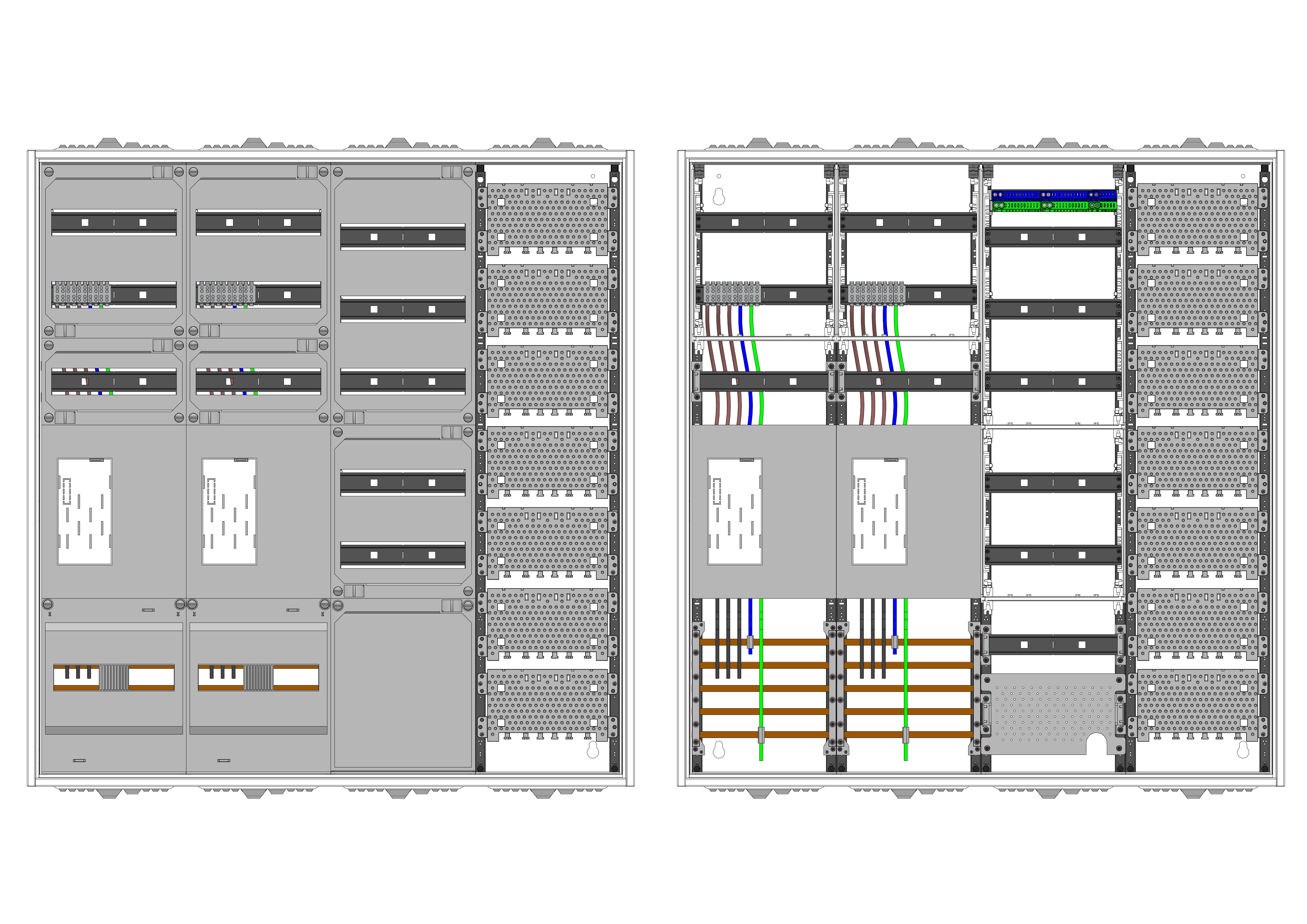 AEZ42-230-030, eHZ-Zählerverteilung nach VDE 0603, DIN43870, 4100:2019-04 für den Innenbereich für Wandbefestigung AP/UP, Fabr. Alphatec, BxHxT [mm] = 1050x1100x230, Schutzklasse II, IP54, RAL 7035, Bestehend aus: Gehäuse, Doppeltür mit Schwenkhebel für Profilhalbzylinder, Flansche SF45 (oben) und SF41 (unten) und Berührungsschutzabdeckungen, aufgebaut wie folgt: 2x Zählerplatz, 5x Hutschienen in Verteilerfeld 1 (12TE), 1x APZ in Verteilerfeld 1, 1x Medienfeld 1 Feld breit, komplett zusammengebaut und verdrahtet gemäß VNB.0001