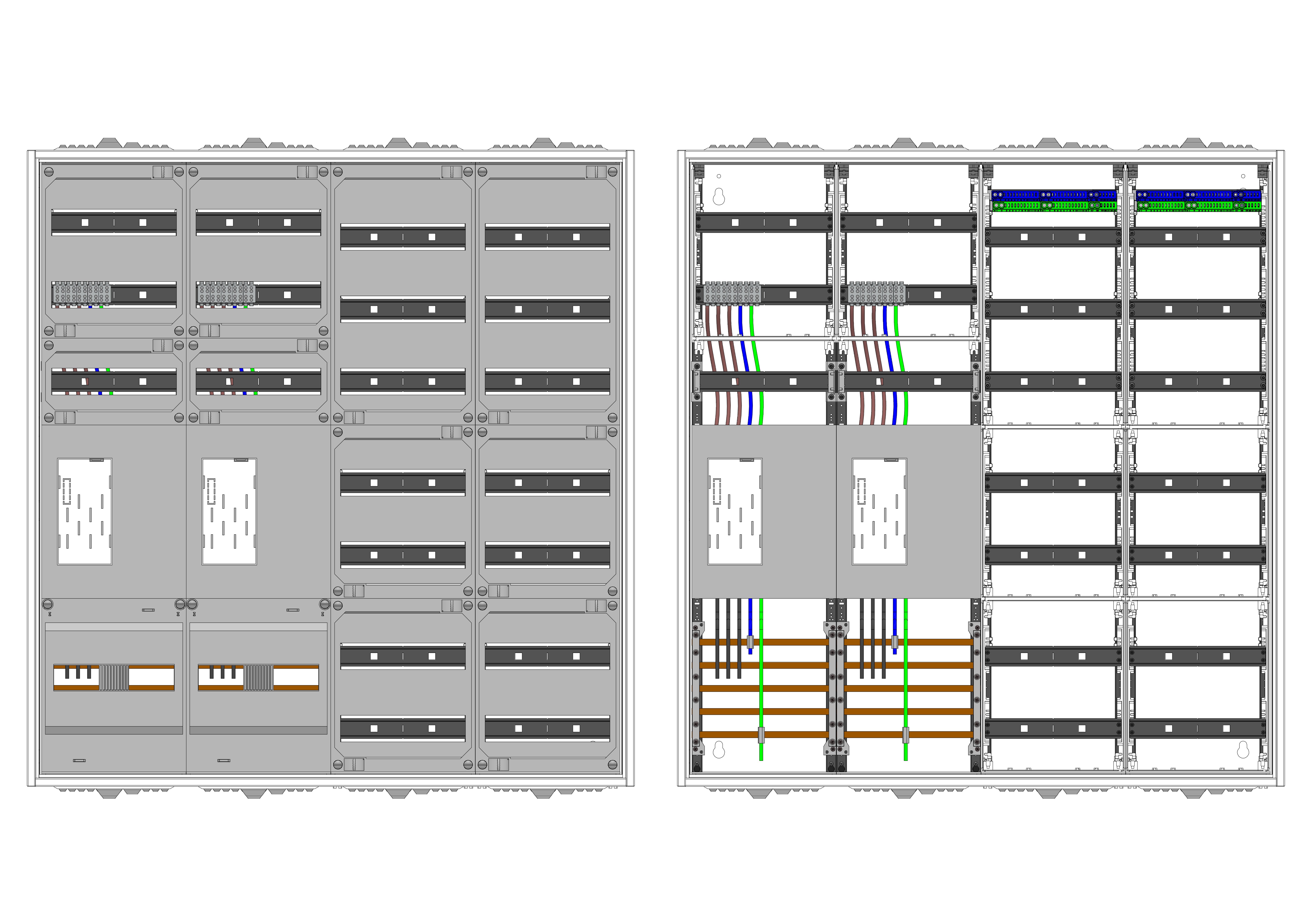 AEZ42-230-038, eHZ-Zählerverteilung nach VDE 0603, DIN43870, 4100:2019-04 für den Innenbereich für Wandbefestigung AP/UP, Fabr. Alphatec, BxHxT [mm] = 1050x1100x230, Schutzklasse II, IP54, RAL 7035, Bestehend aus: Gehäuse, Doppeltür mit Schwenkhebel für Profilhalbzylinder, Flansche SF45 (oben) und SF41 (unten) und Berührungsschutzabdeckungen, aufgebaut wie folgt: 2x Zählerplatz, 1x TSG-Platte, 7x Hutschienen in Verteilerfeld 1 (12TE), 7x Hutschienen in Verteilerfeld 2 (12TE), geeignet für TSG-Hutschienenmontage: ja, inkl. Querverdrahtung, komplett zusammengebaut und verdrahtet gemäß VNB.0001