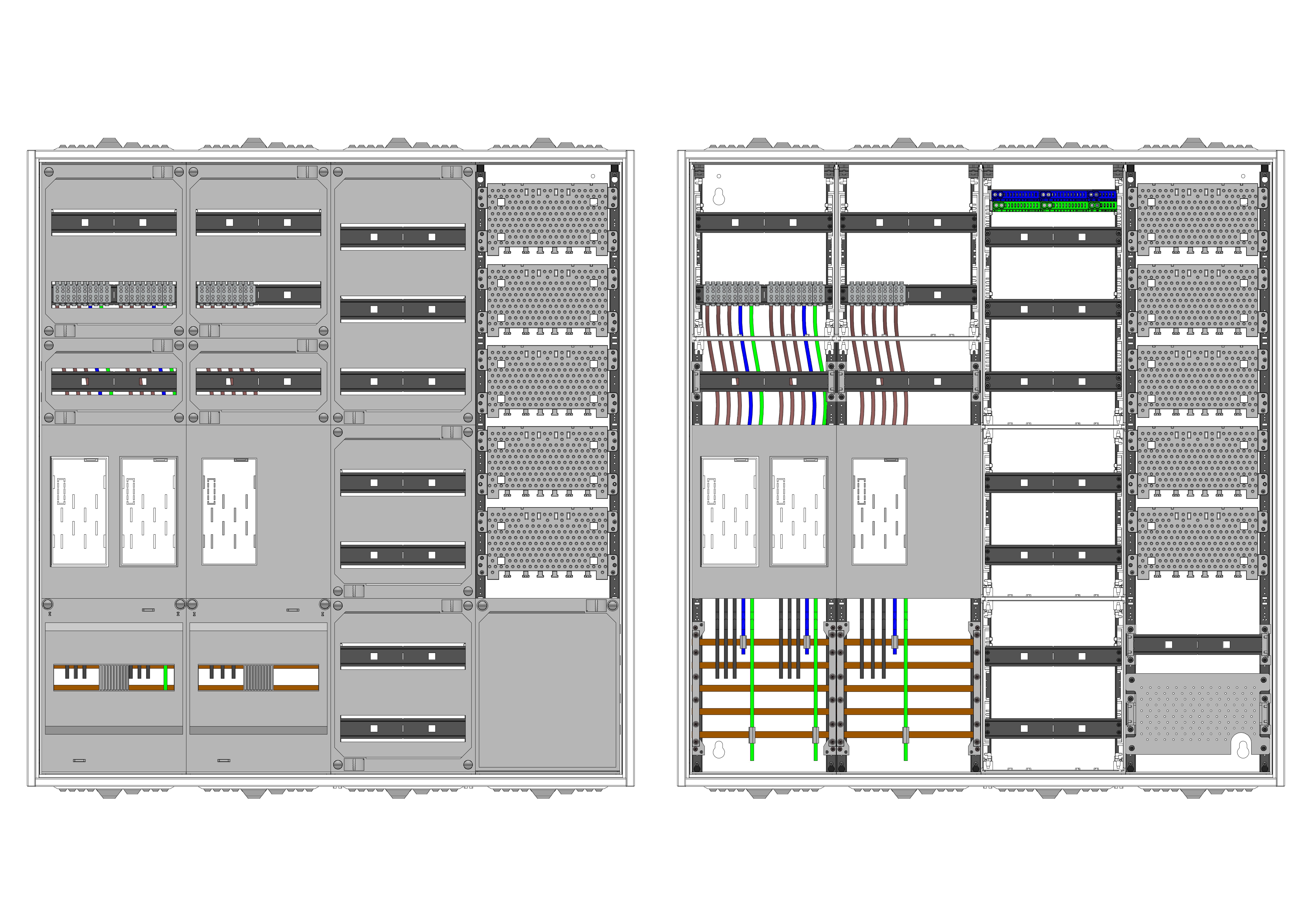 AEZ42-230-041, eHZ-Zählerverteilung nach VDE 0603, DIN43870, 4100:2019-04 für den Innenbereich für Wandbefestigung AP/UP, Fabr. Alphatec, BxHxT [mm] = 1050x1100x230, Schutzklasse II, IP54, RAL 7035, Bestehend aus: Gehäuse, Doppeltür mit Schwenkhebel für Profilhalbzylinder, Flansche SF45 (oben) und SF41 (unten) und Berührungsschutzabdeckungen, aufgebaut wie folgt: 3x Zählerplatz, 7x Hutschienen in Verteilerfeld 1 (12TE), 1x Medienfeld 1 Feld breit inkl. APZ, komplett zusammengebaut und verdrahtet gemäß VNB.0001