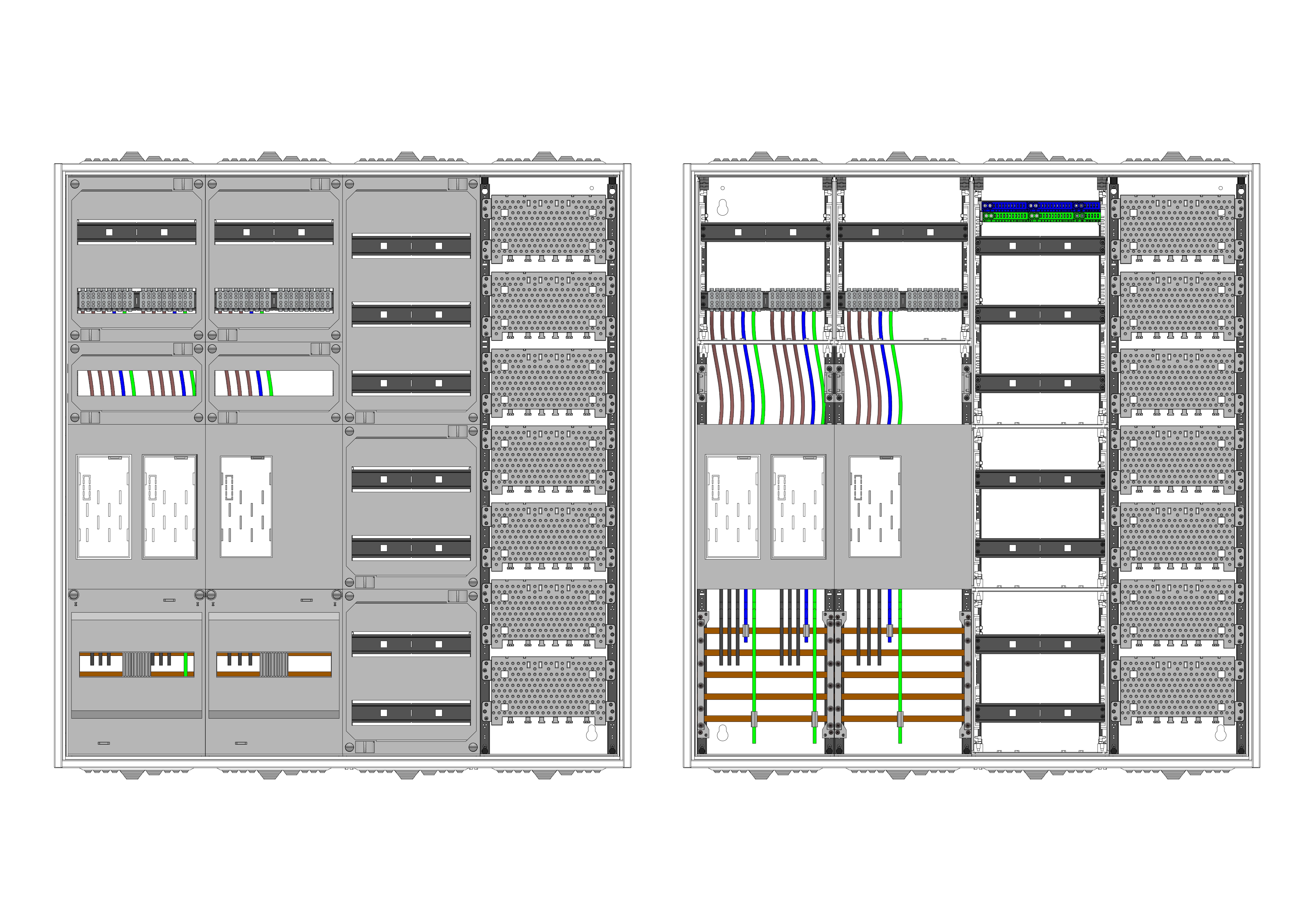 AEZ42-230-044, eHZ-Zählerverteilung nach VDE 0603, DIN43870, 4100:2019-04 für den Innenbereich für Wandbefestigung AP/UP, Fabr. Alphatec, BxHxT [mm] = 1050x1100x230, Schutzklasse II, IP54, RAL 7035, Bestehend aus: Gehäuse, Doppeltür mit Schwenkhebel für Profilhalbzylinder, Flansche SF45 (oben) und SF41 (unten) und Berührungsschutzabdeckungen, aufgebaut wie folgt: 3x Zählerplatz, 1x TSG-Platte, 7x Hutschienen in Verteilerfeld 1 (12TE), 1x Medienfeld 1 Feld breit, geeignet für TSG-Hutschienenmontage: ja, inkl. Querverdrahtung, komplett zusammengebaut und verdrahtet gemäß VNB.0001
