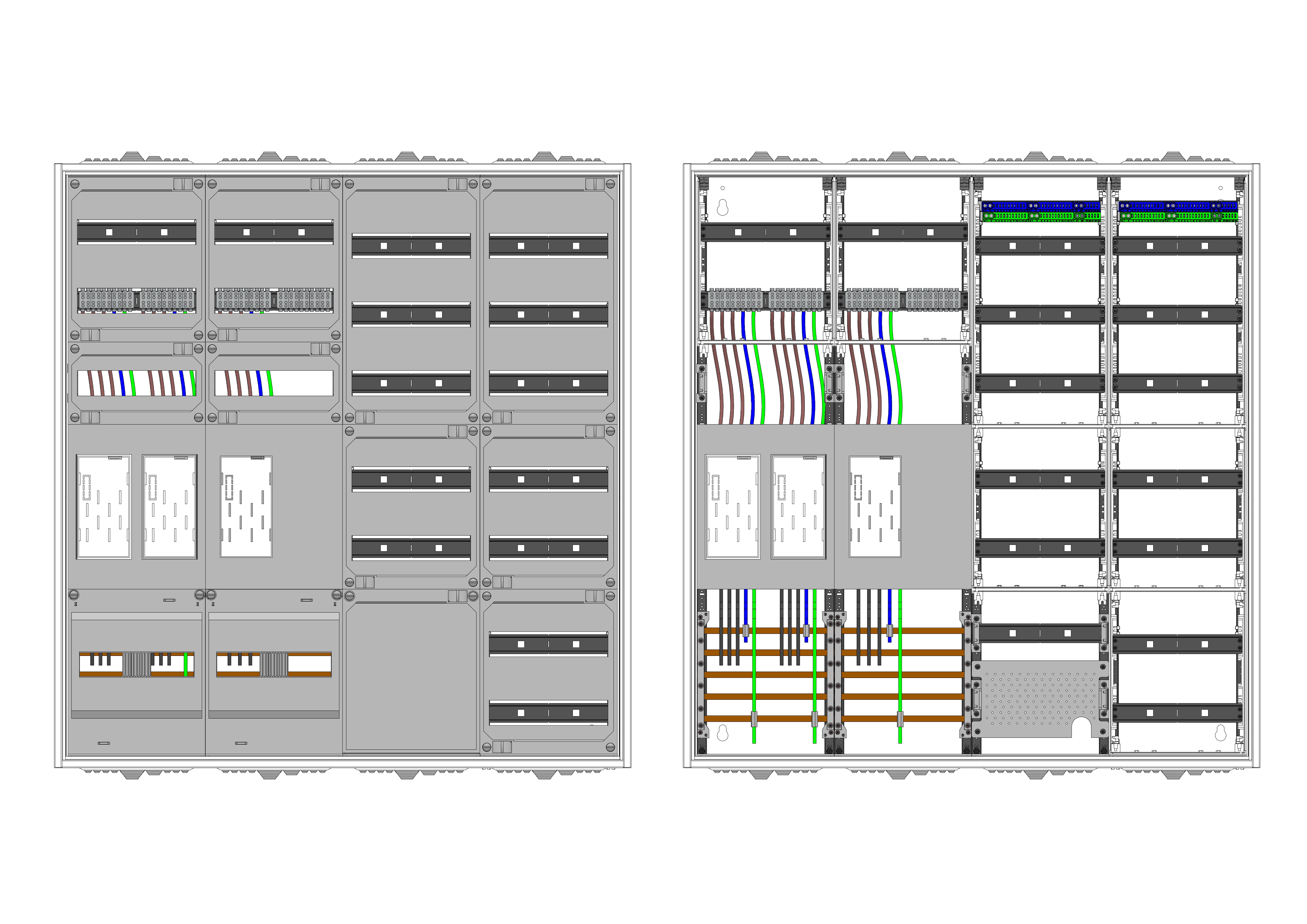 AEZ42-230-047, eHZ-Zählerverteilung nach VDE 0603, DIN43870, 4100:2019-04 für den Innenbereich für Wandbefestigung AP/UP, Fabr. Alphatec, BxHxT [mm] = 1050x1100x230, Schutzklasse II, IP54, RAL 7035, Bestehend aus: Gehäuse, Doppeltür mit Schwenkhebel für Profilhalbzylinder, Flansche SF45 (oben) und SF41 (unten) und Berührungsschutzabdeckungen, aufgebaut wie folgt: 3x Zählerplatz, 1x TSG-Platte, 5x Hutschienen in Verteilerfeld 1 (12TE), 1x APZ in Verteilerfeld 1, 7x Hutschienen in Verteilerfeld 2 (12TE), geeignet für TSG-Hutschienenmontage: ja, inkl. Querverdrahtung, komplett zusammengebaut und verdrahtet gemäß VNB.0001