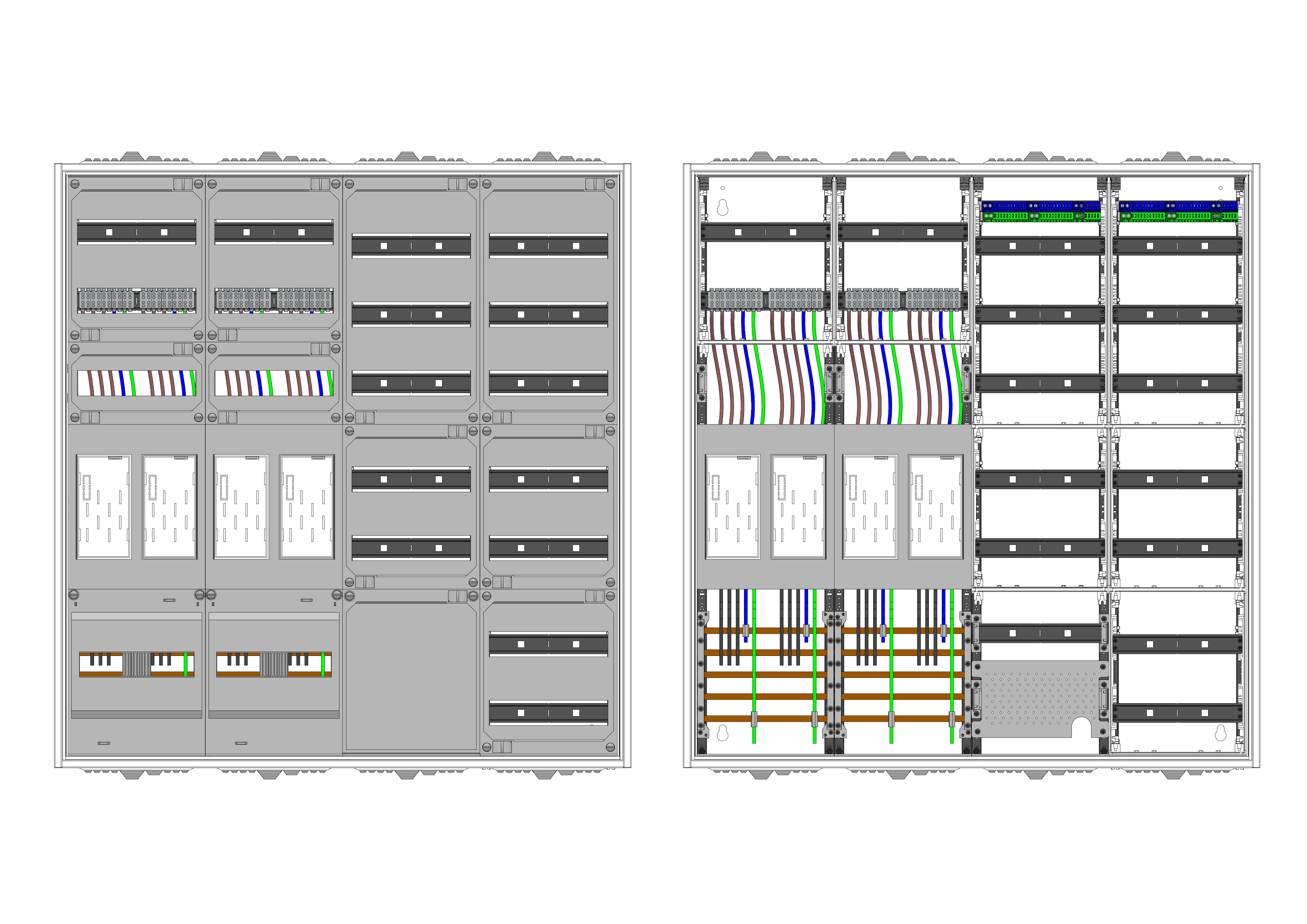 AEZ42-230-052, eHZ-Zählerverteilung nach VDE 0603, DIN43870, 4100:2019-04 für den Innenbereich für Wandbefestigung AP/UP, Fabr. Alphatec, BxHxT [mm] = 1050x1100x230, Schutzklasse II, IP54, RAL 7035, Bestehend aus: Gehäuse, Doppeltür mit Schwenkhebel für Profilhalbzylinder, Flansche SF45 (oben) und SF41 (unten) und Berührungsschutzabdeckungen, aufgebaut wie folgt: 4x Zählerplatz, 5x Hutschienen in Verteilerfeld 1 (12TE), 1x APZ in Verteilerfeld 1, 7x Hutschienen in Verteilerfeld 2 (12TE), komplett zusammengebaut und verdrahtet gemäß VNB.0001