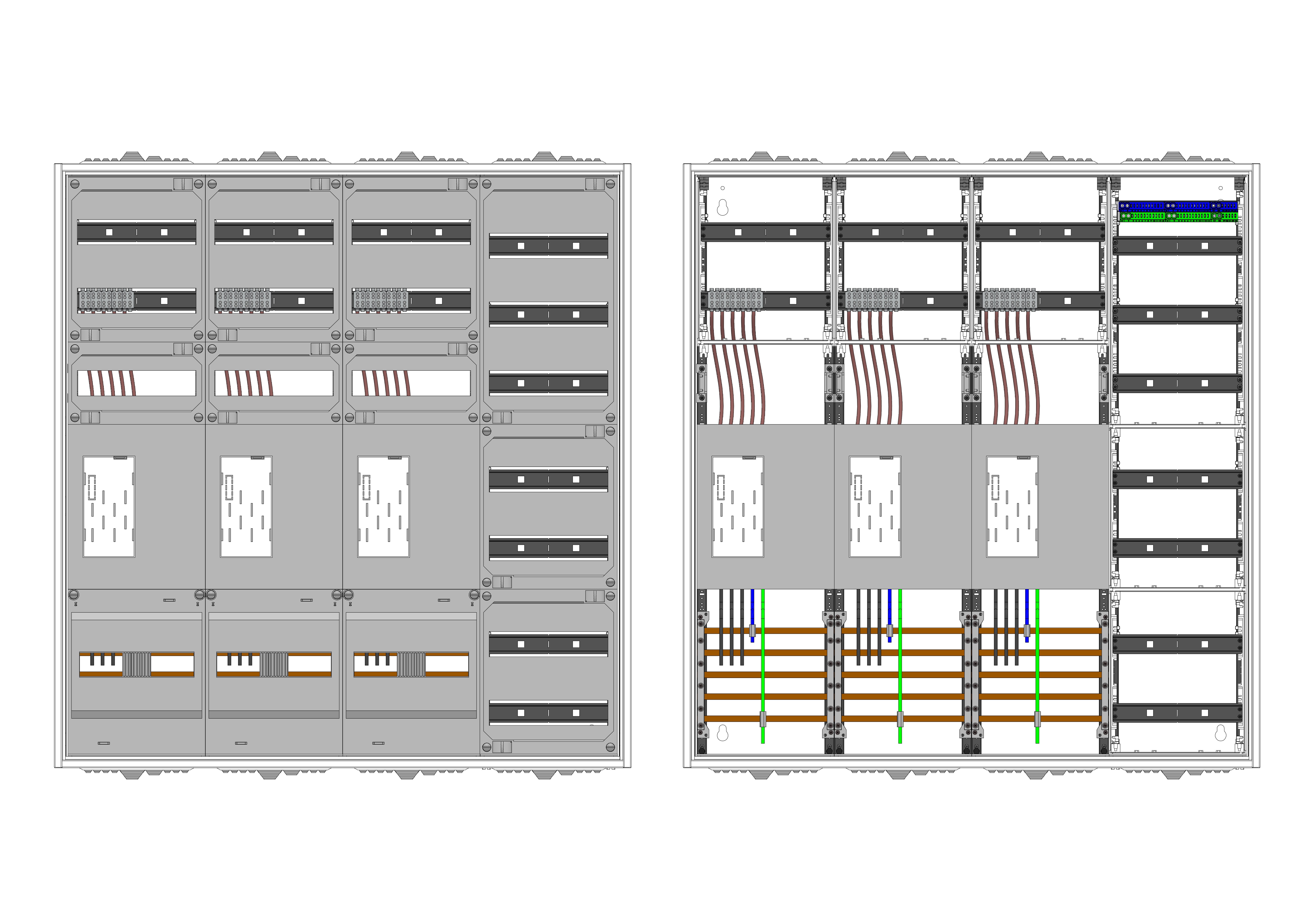 AEZ42-230-054, eHZ-Zählerverteilung nach VDE 0603, DIN43870, 4100:2019-04 für den Innenbereich für Wandbefestigung AP/UP, Fabr. Alphatec, BxHxT [mm] = 1050x1100x230, Schutzklasse II, IP54, RAL 7035, Bestehend aus: Gehäuse, Doppeltür mit Schwenkhebel für Profilhalbzylinder, Flansche SF45 (oben) und SF41 (unten) und Berührungsschutzabdeckungen, aufgebaut wie folgt: 3x Zählerplatz, 7x Hutschienen in Verteilerfeld 1 (12TE), komplett zusammengebaut und verdrahtet gemäß VNB.0001