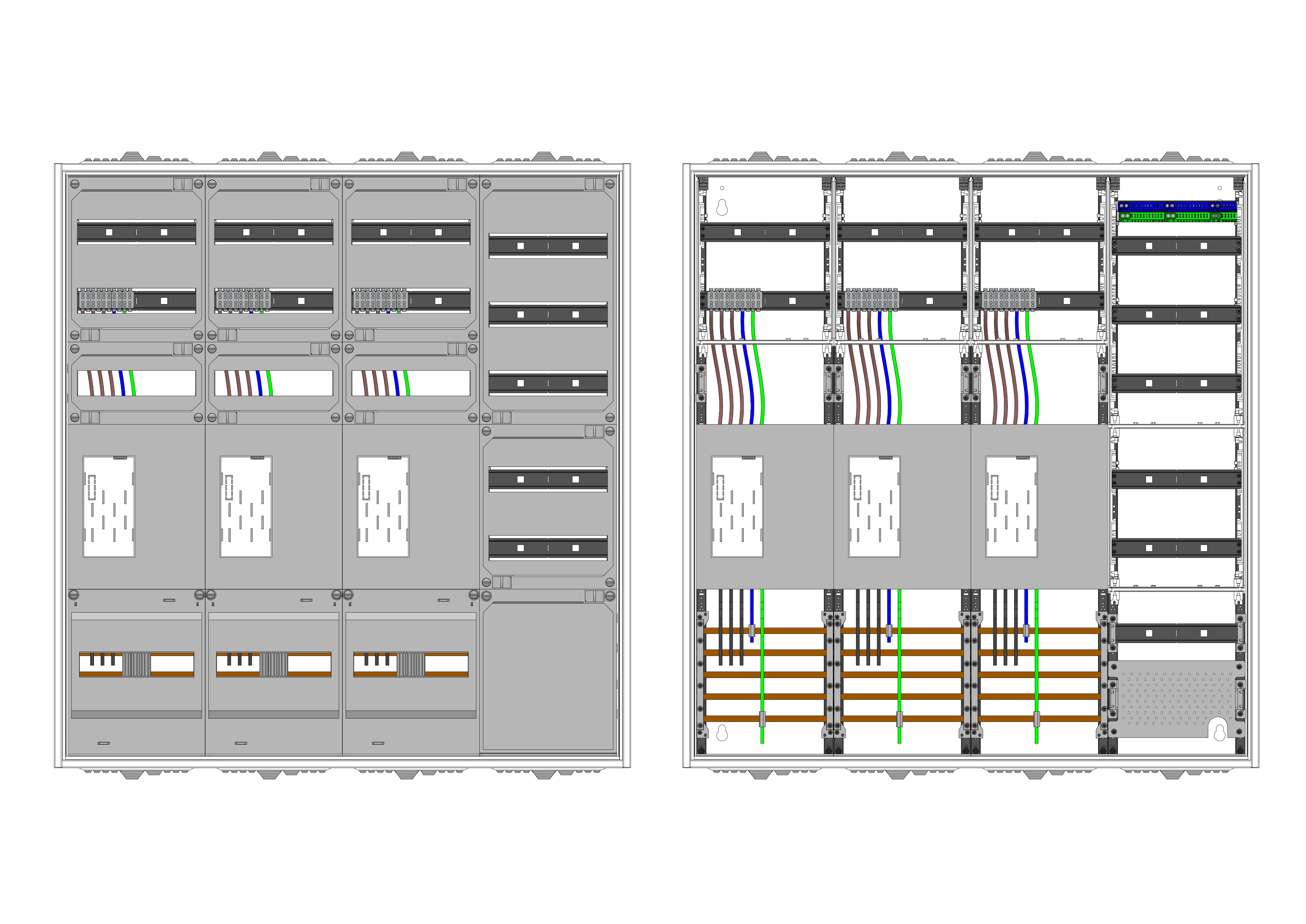 AEZ42-230-055, eHZ-Zählerverteilung nach VDE 0603, DIN43870, 4100:2019-04 für den Innenbereich für Wandbefestigung AP/UP, Fabr. Alphatec, BxHxT [mm] = 1050x1100x230, Schutzklasse II, IP54, RAL 7035, Bestehend aus: Gehäuse, Doppeltür mit Schwenkhebel für Profilhalbzylinder, Flansche SF45 (oben) und SF41 (unten) und Berührungsschutzabdeckungen, aufgebaut wie folgt: 3x Zählerplatz, 5x Hutschienen in Verteilerfeld 1 (12TE), 1x APZ in Verteilerfeld 1, komplett zusammengebaut und verdrahtet gemäß VNB.0001