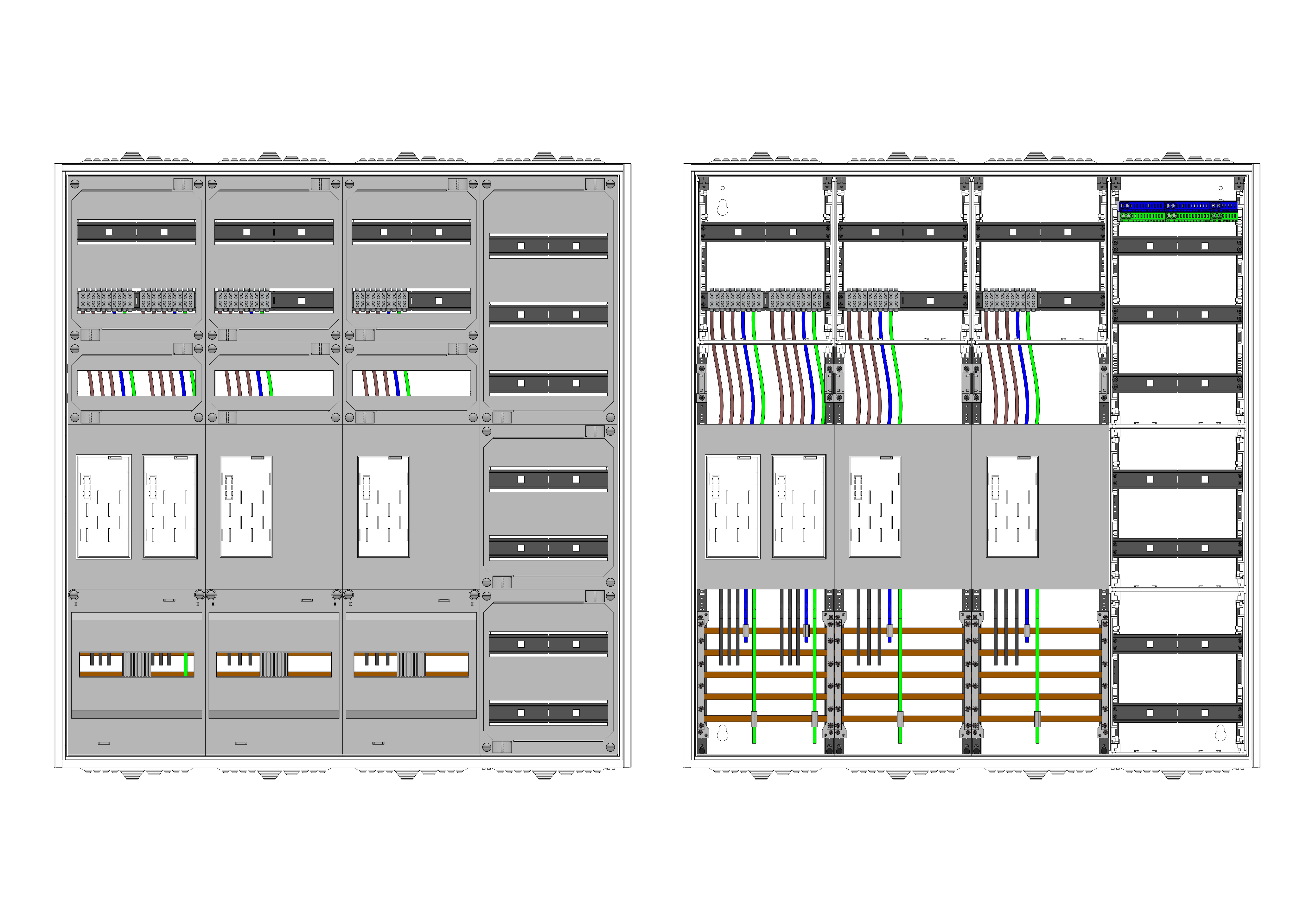 AEZ42-230-058, eHZ-Zählerverteilung nach VDE 0603, DIN43870, 4100:2019-04 für den Innenbereich für Wandbefestigung AP/UP, Fabr. Alphatec, BxHxT [mm] = 1050x1100x230, Schutzklasse II, IP54, RAL 7035, Bestehend aus: Gehäuse, Doppeltür mit Schwenkhebel für Profilhalbzylinder, Flansche SF45 (oben) und SF41 (unten) und Berührungsschutzabdeckungen, aufgebaut wie folgt: 4x Zählerplatz, 7x Hutschienen in Verteilerfeld 1 (12TE), komplett zusammengebaut und verdrahtet gemäß VNB.0001