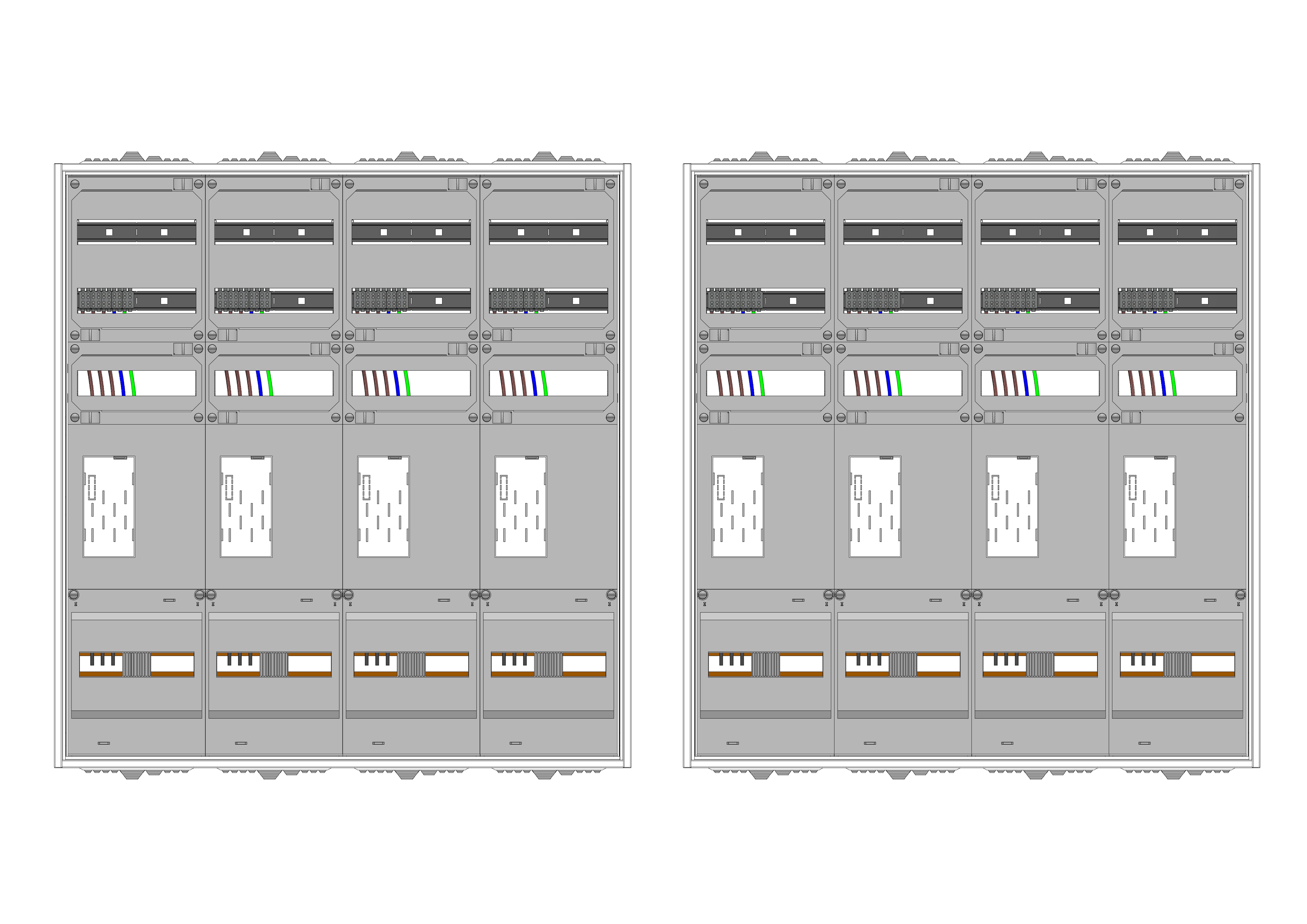 AEZ42-230-072, eHZ-Zählerverteilung nach VDE 0603, DIN43870, 4100:2019-04 für den Innenbereich für Wandbefestigung AP/UP, Fabr. Alphatec, BxHxT [mm] = 1050x1100x230, Schutzklasse II, IP54, RAL 7035, Bestehend aus: Gehäuse, Doppeltür mit Schwenkhebel für Profilhalbzylinder, Flansche SF45 (oben) und SF41 (unten) und Berührungsschutzabdeckungen, aufgebaut wie folgt: 4x Zählerplatz, komplett zusammengebaut und verdrahtet gemäß VNB.0001
