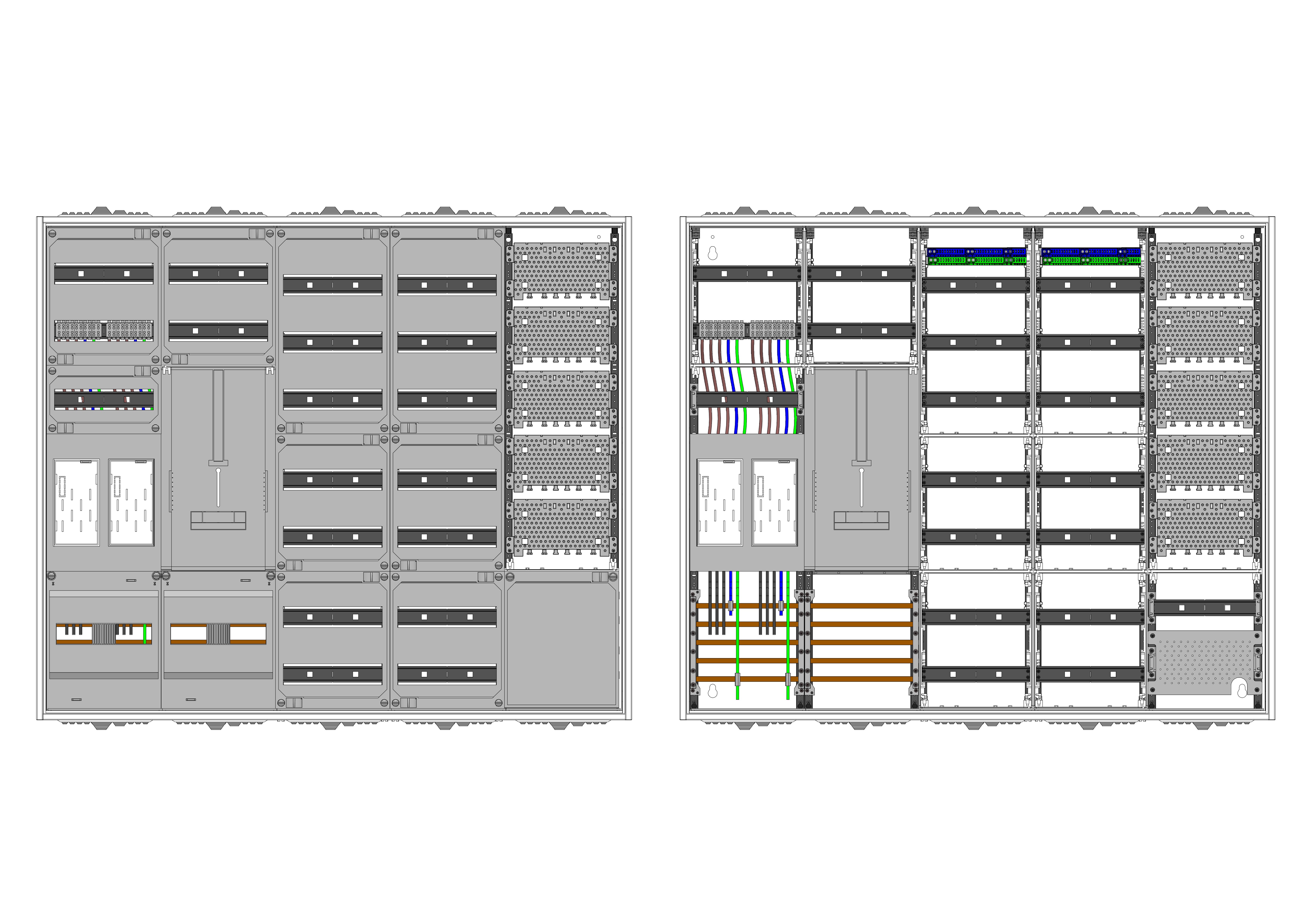 AEZ52-230-013, eHZ-Zählerverteilung nach VDE 0603, DIN43870, 4100:2019-04 für den Innenbereich für Wandbefestigung AP/UP, Fabr. Alphatec, BxHxT [mm] = 1300x1100x230, Schutzklasse II, IP54, RAL 7035, Bestehend aus: Gehäuse, Doppeltür mit Schwenkhebel für Profilhalbzylinder, Flansche SF45 (oben) und SF41 (unten) und Berührungsschutzabdeckungen, aufgebaut wie folgt: 2x Zählerplatz, 1x TSG-Platte, 7x Hutschienen in Verteilerfeld 1 (12TE), 7x Hutschienen in Verteilerfeld 2 (12TE), 1x Medienfeld 1 Feld breit inkl. APZ, geeignet für TSG-Hutschienenmontage: nein, inkl. Querverdrahtung, komplett zusammengebaut und verdrahtet gemäß VNB.0001