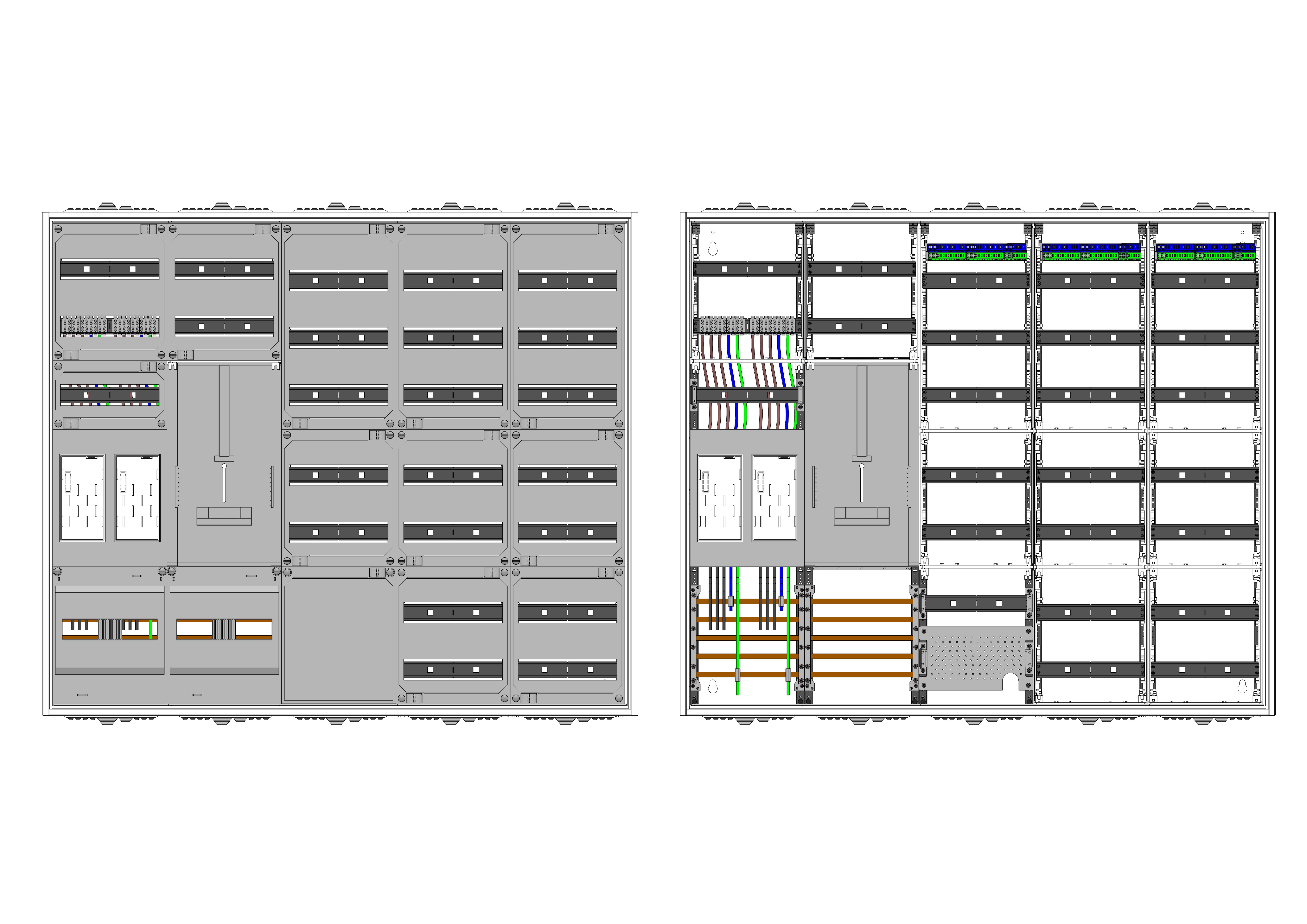 AEZ52-230-015, eHZ-Zählerverteilung nach VDE 0603, DIN43870, 4100:2019-04 für den Innenbereich für Wandbefestigung AP/UP, Fabr. Alphatec, BxHxT [mm] = 1300x1100x230, Schutzklasse II, IP54, RAL 7035, Bestehend aus: Gehäuse, Doppeltür mit Schwenkhebel für Profilhalbzylinder, Flansche SF45 (oben) und SF41 (unten) und Berührungsschutzabdeckungen, aufgebaut wie folgt: 2x Zählerplatz, 1x TSG-Platte, 5x Hutschienen in Verteilerfeld 1 (12TE), 1x APZ in Verteilerfeld 1, 7x Hutschienen in Verteilerfeld 2 (12TE), 7x Hutschienen in Verteilerfeld 3 (12TE), geeignet für TSG-Hutschienenmontage: nein, inkl. Querverdrahtung, komplett zusammengebaut und verdrahtet gemäß VNB.0001
