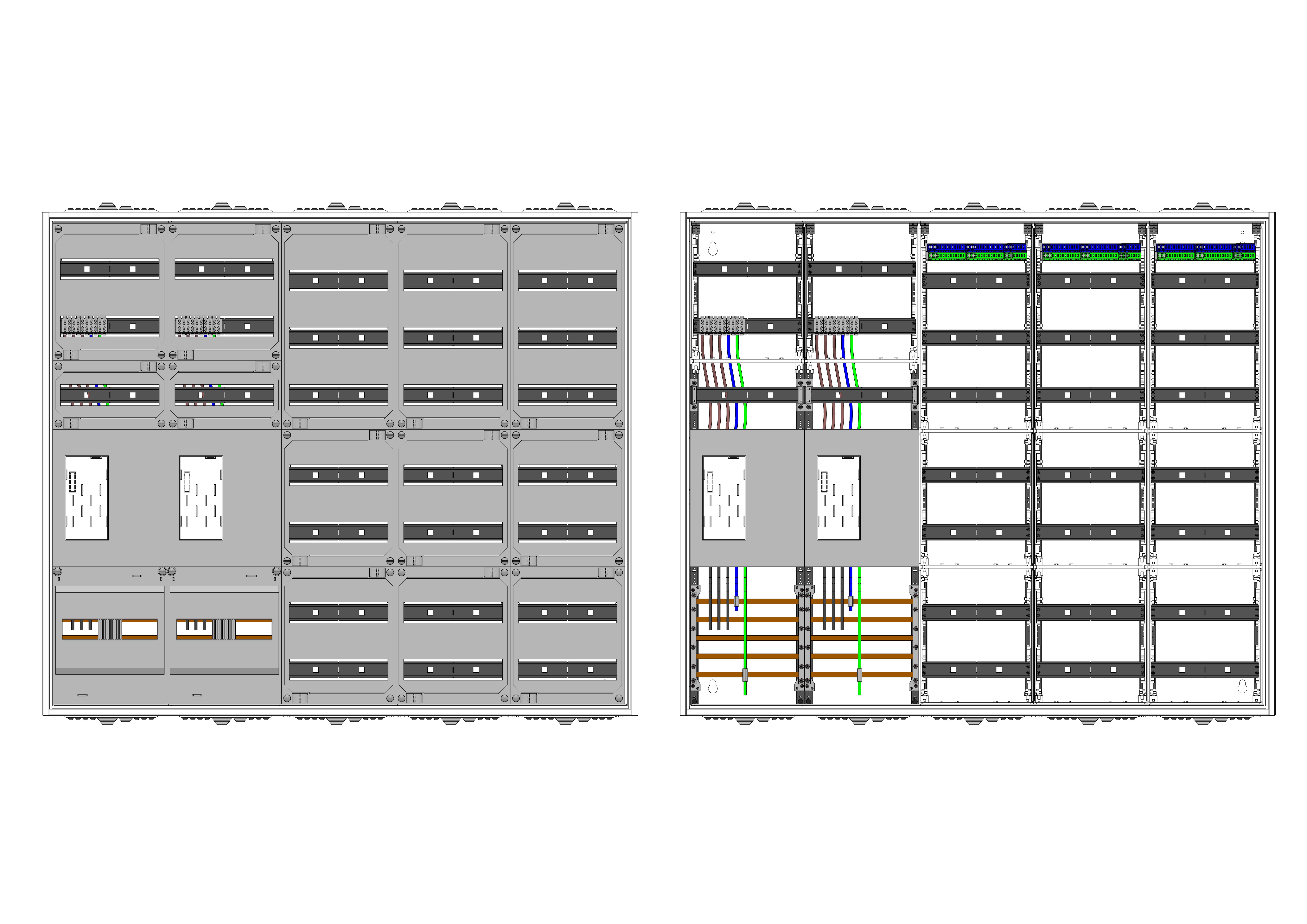 AEZ52-230-024, eHZ-Zählerverteilung nach VDE 0603, DIN43870, 4100:2019-04 für den Innenbereich für Wandbefestigung AP/UP, Fabr. Alphatec, BxHxT [mm] = 1300x1100x230, Schutzklasse II, IP54, RAL 7035, Bestehend aus: Gehäuse, Doppeltür mit Schwenkhebel für Profilhalbzylinder, Flansche SF45 (oben) und SF41 (unten) und Berührungsschutzabdeckungen, aufgebaut wie folgt: 2x Zählerplatz, 7x Hutschienen in Verteilerfeld 1 (12TE), 7x Hutschienen in Verteilerfeld 2 (12TE), 7x Hutschienen in Verteilerfeld 3 (12TE), komplett zusammengebaut und verdrahtet gemäß VNB.0001
