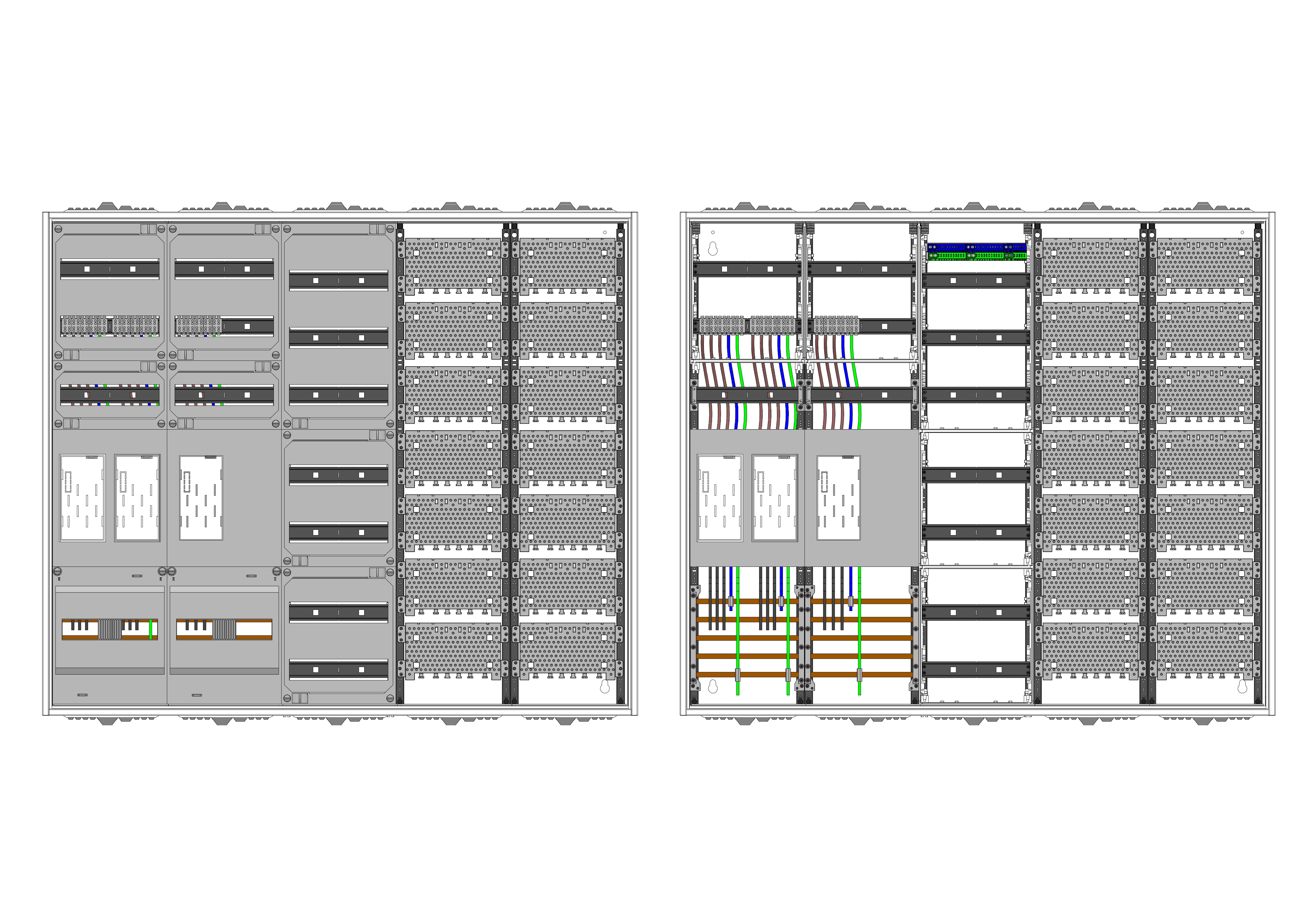 AEZ52-230-025, eHZ-Zählerverteilung nach VDE 0603, DIN43870, 4100:2019-04 für den Innenbereich für Wandbefestigung AP/UP, Fabr. Alphatec, BxHxT [mm] = 1300x1100x230, Schutzklasse II, IP54, RAL 7035, Bestehend aus: Gehäuse, Doppeltür mit Schwenkhebel für Profilhalbzylinder, Flansche SF45 (oben) und SF41 (unten) und Berührungsschutzabdeckungen, aufgebaut wie folgt: 3x Zählerplatz, 7x Hutschienen in Verteilerfeld 1 (12TE), 1x Medienfeld 2 Feld breit, komplett zusammengebaut und verdrahtet gemäß VNB.0001