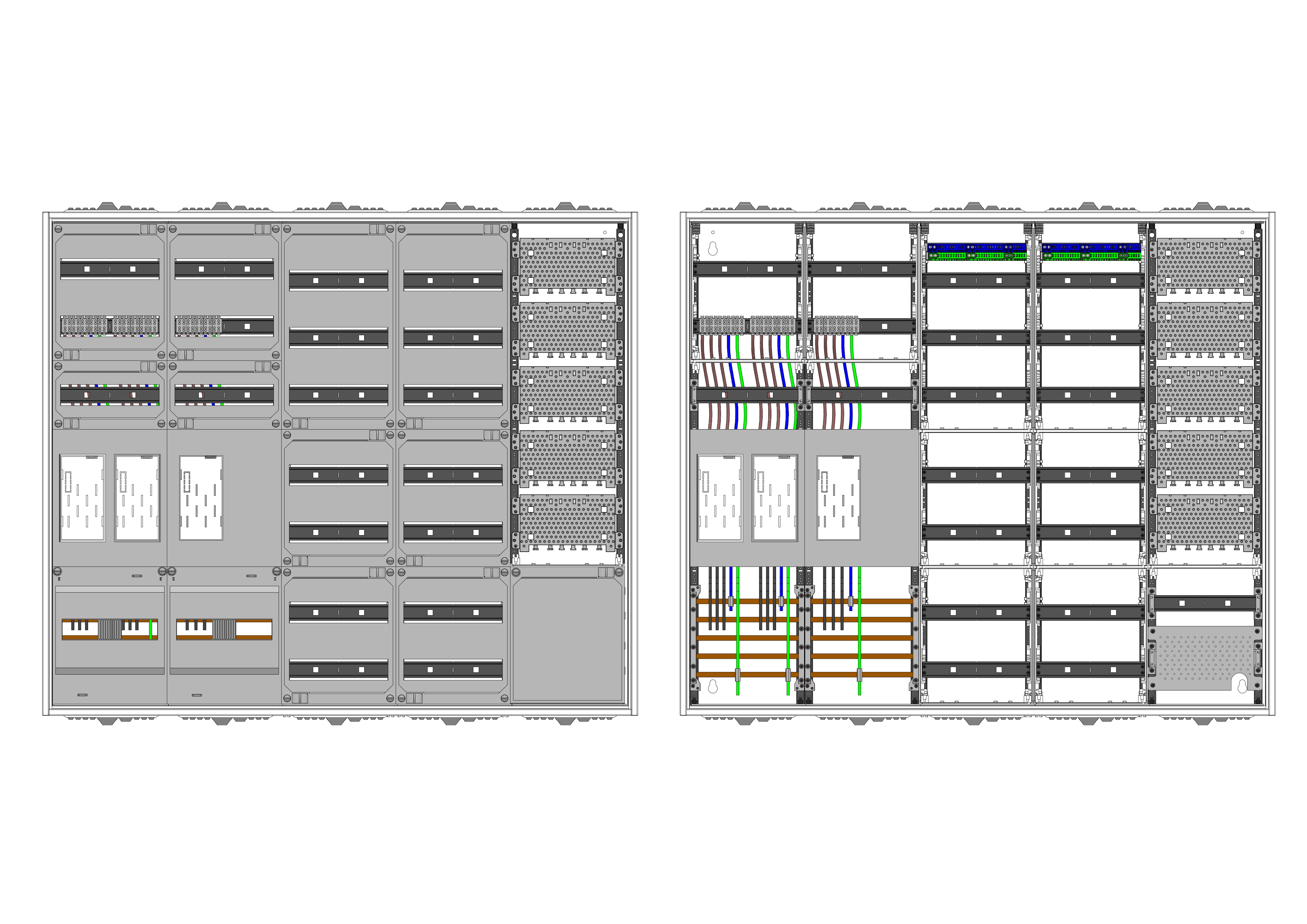 AEZ52-230-053, eHZ-Zählerverteilung nach VDE 0603, DIN43870, 4100:2019-04 für den Innenbereich für Wandbefestigung AP/UP, Fabr. Alphatec, BxHxT [mm] = 1300x1100x230, Schutzklasse II, IP54, RAL 7035, Bestehend aus: Gehäuse, Doppeltür mit Schwenkhebel für Profilhalbzylinder, Flansche SF45 (oben) und SF41 (unten) und Berührungsschutzabdeckungen, aufgebaut wie folgt: 3x Zählerplatz, 1x TSG-Platte, 7x Hutschienen in Verteilerfeld 1 (12TE), 7x Hutschienen in Verteilerfeld 2 (12TE), 1x Medienfeld 1 Feld breit inkl. APZ, geeignet für TSG-Hutschienenmontage: ja, inkl. Querverdrahtung, komplett zusammengebaut und verdrahtet gemäß VNB.0001