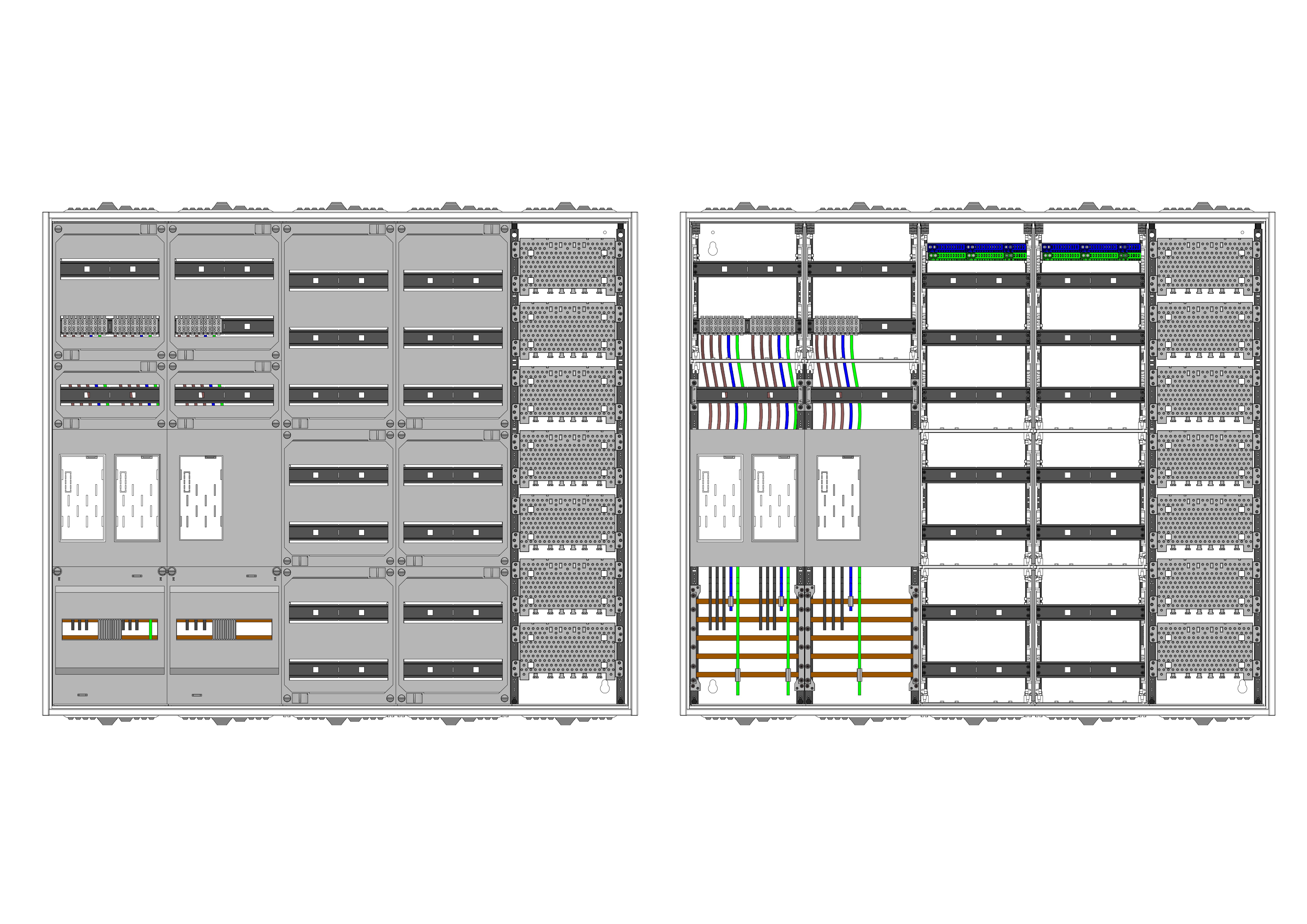 AEZ52-230-054, eHZ-Zählerverteilung nach VDE 0603, DIN43870, 4100:2019-04 für den Innenbereich für Wandbefestigung AP/UP, Fabr. Alphatec, BxHxT [mm] = 1300x1100x230, Schutzklasse II, IP54, RAL 7035, Bestehend aus: Gehäuse, Doppeltür mit Schwenkhebel für Profilhalbzylinder, Flansche SF45 (oben) und SF41 (unten) und Berührungsschutzabdeckungen, aufgebaut wie folgt: 3x Zählerplatz, 1x TSG-Platte, 7x Hutschienen in Verteilerfeld 1 (12TE), 7x Hutschienen in Verteilerfeld 2 (12TE), 1x Medienfeld 1 Feld breit, geeignet für TSG-Hutschienenmontage: ja, inkl. Querverdrahtung, komplett zusammengebaut und verdrahtet gemäß VNB.0001