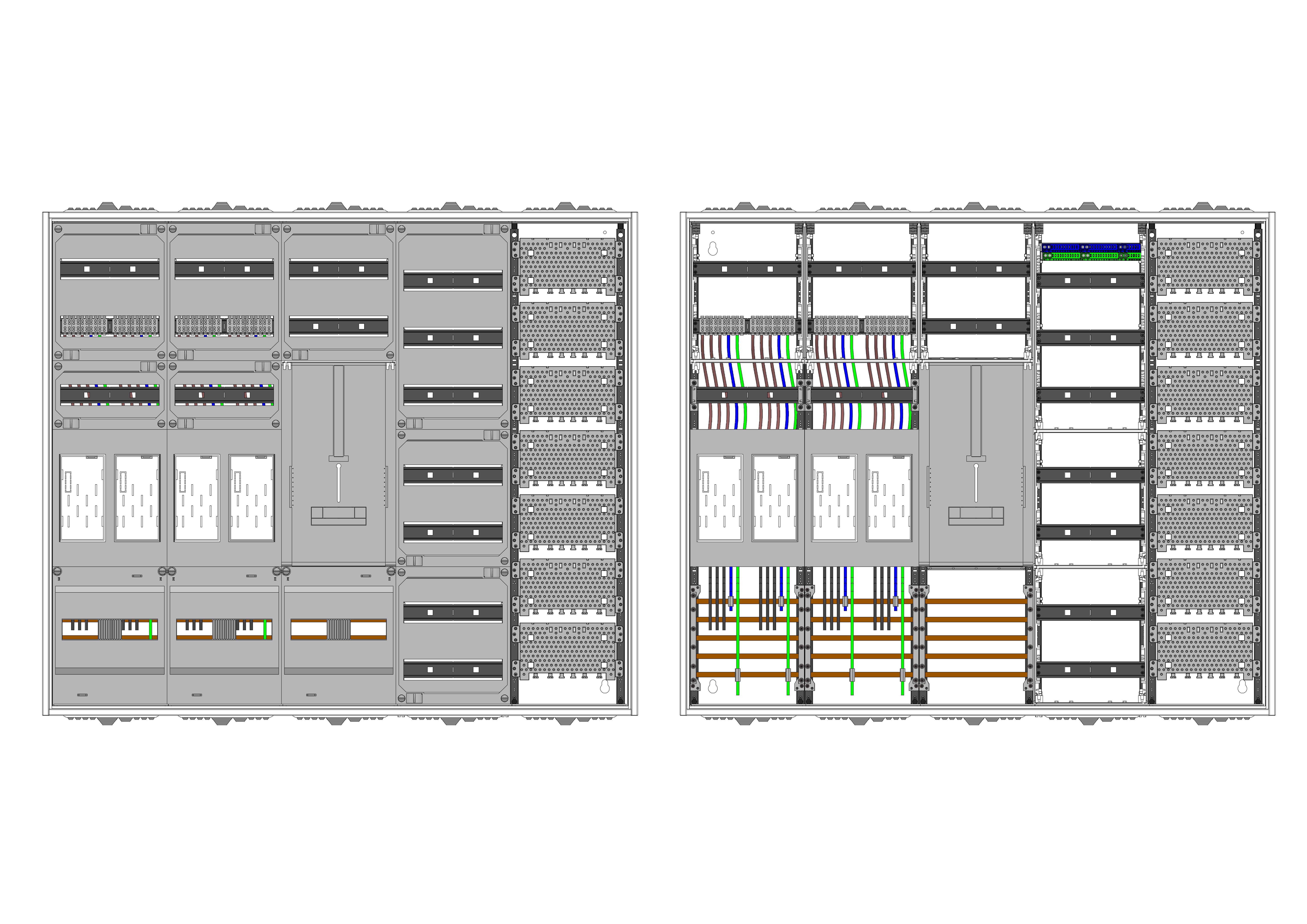 AEZ52-230-068, eHZ-Zählerverteilung nach VDE 0603, DIN43870, 4100:2019-04 für den Innenbereich für Wandbefestigung AP/UP, Fabr. Alphatec, BxHxT [mm] = 1300x1100x230, Schutzklasse II, IP54, RAL 7035, Bestehend aus: Gehäuse, Doppeltür mit Schwenkhebel für Profilhalbzylinder, Flansche SF45 (oben) und SF41 (unten) und Berührungsschutzabdeckungen, aufgebaut wie folgt: 4x Zählerplatz, 1x TSG-Platte, 7x Hutschienen in Verteilerfeld 1 (12TE), 1x Medienfeld 1 Feld breit, geeignet für TSG-Hutschienenmontage: nein, inkl. Querverdrahtung, komplett zusammengebaut und verdrahtet gemäß VNB.0001