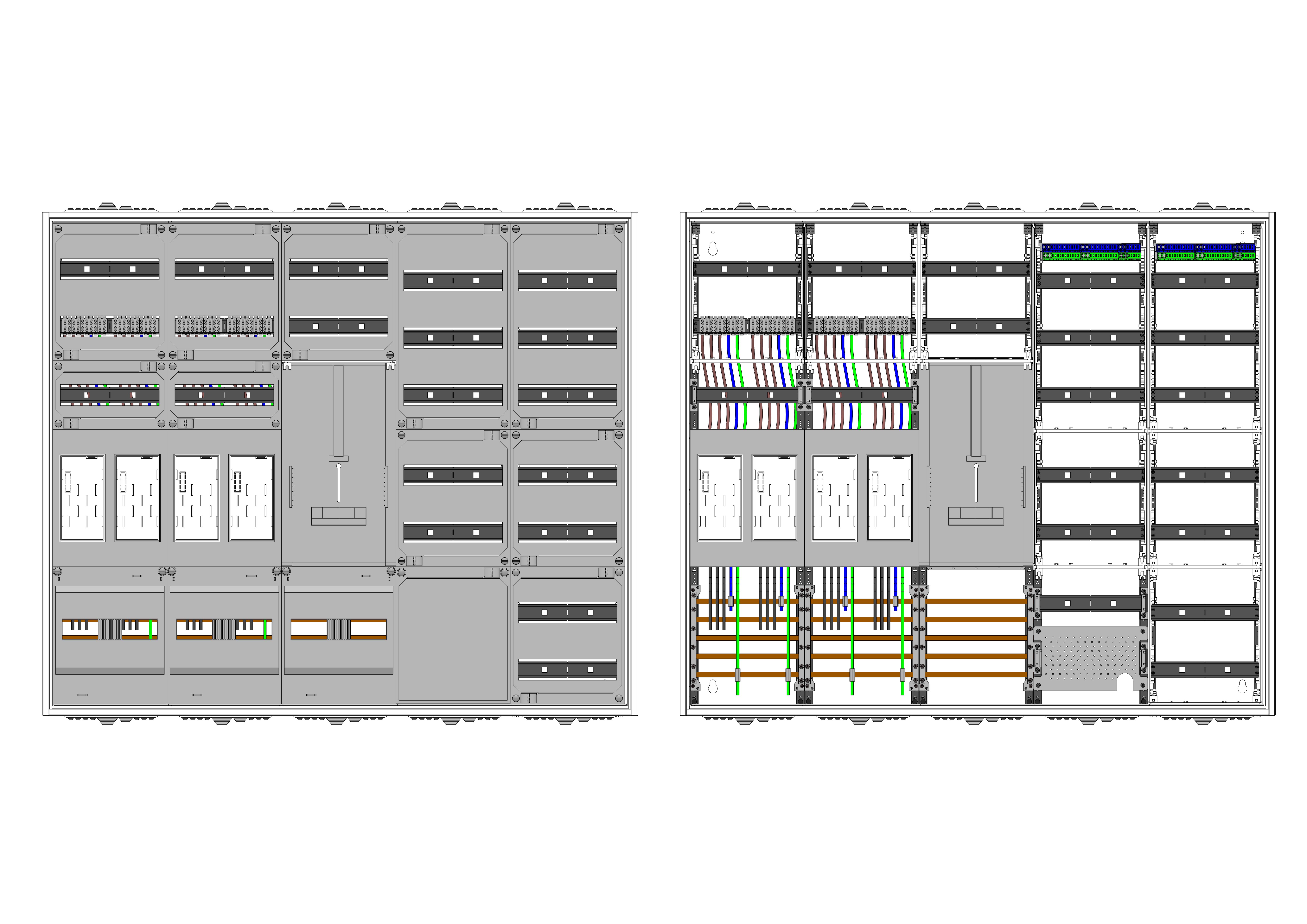 AEZ52-230-070, eHZ-Zählerverteilung nach VDE 0603, DIN43870, 4100:2019-04 für den Innenbereich für Wandbefestigung AP/UP, Fabr. Alphatec, BxHxT [mm] = 1300x1100x230, Schutzklasse II, IP54, RAL 7035, Bestehend aus: Gehäuse, Doppeltür mit Schwenkhebel für Profilhalbzylinder, Flansche SF45 (oben) und SF41 (unten) und Berührungsschutzabdeckungen, aufgebaut wie folgt: 4x Zählerplatz, 1x TSG-Platte, 5x Hutschienen in Verteilerfeld 1 (12TE), 1x APZ in Verteilerfeld 1, 7x Hutschienen in Verteilerfeld 2 (12TE), geeignet für TSG-Hutschienenmontage: nein, inkl. Querverdrahtung, komplett zusammengebaut und verdrahtet gemäß VNB.0001