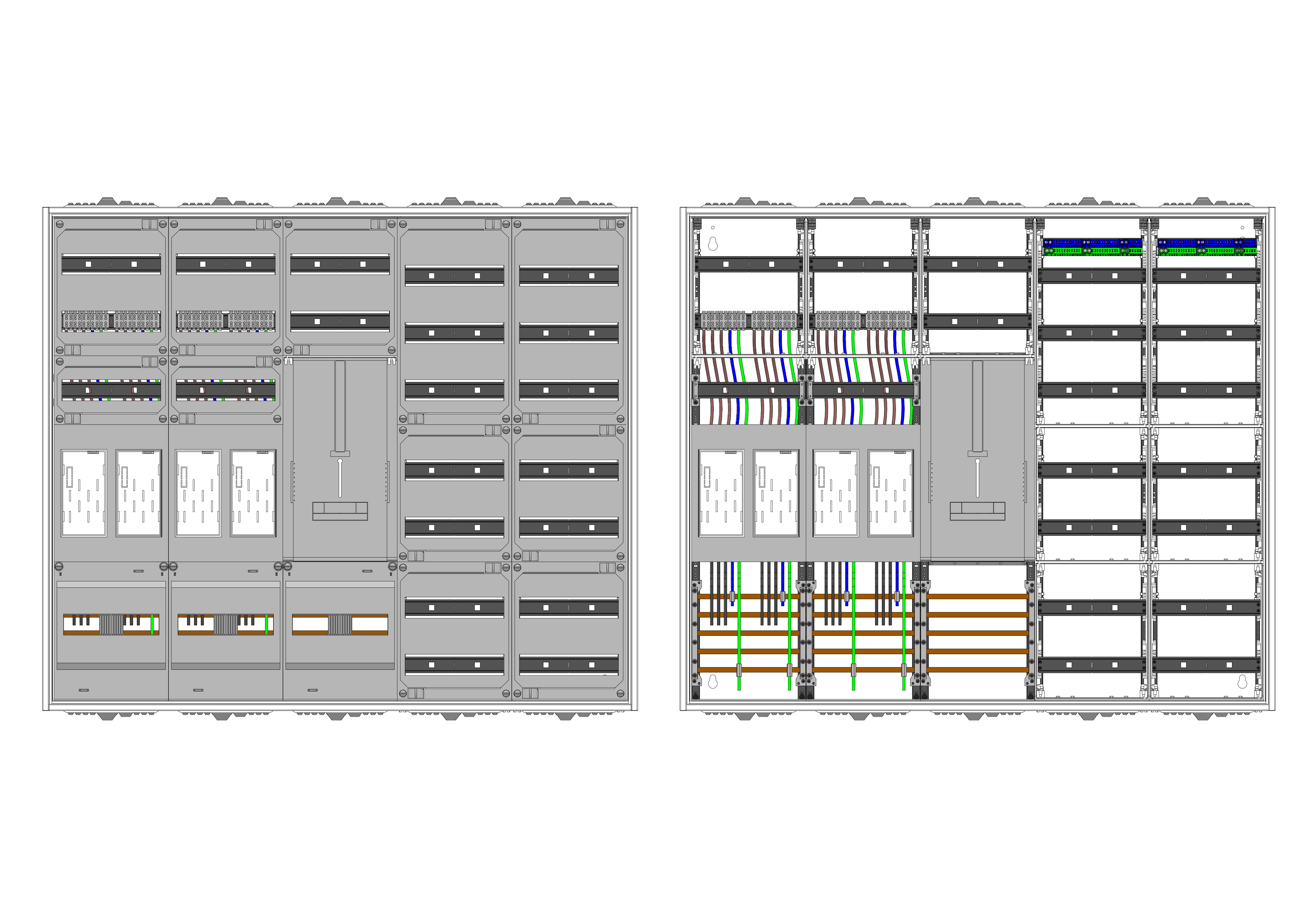 AEZ52-230-071, eHZ-Zählerverteilung nach VDE 0603, DIN43870, 4100:2019-04 für den Innenbereich für Wandbefestigung AP/UP, Fabr. Alphatec, BxHxT [mm] = 1300x1100x230, Schutzklasse II, IP54, RAL 7035, Bestehend aus: Gehäuse, Doppeltür mit Schwenkhebel für Profilhalbzylinder, Flansche SF45 (oben) und SF41 (unten) und Berührungsschutzabdeckungen, aufgebaut wie folgt: 4x Zählerplatz, 1x TSG-Platte, 7x Hutschienen in Verteilerfeld 1 (12TE), 7x Hutschienen in Verteilerfeld 2 (12TE), geeignet für TSG-Hutschienenmontage: nein, inkl. Querverdrahtung, komplett zusammengebaut und verdrahtet gemäß VNB.0001