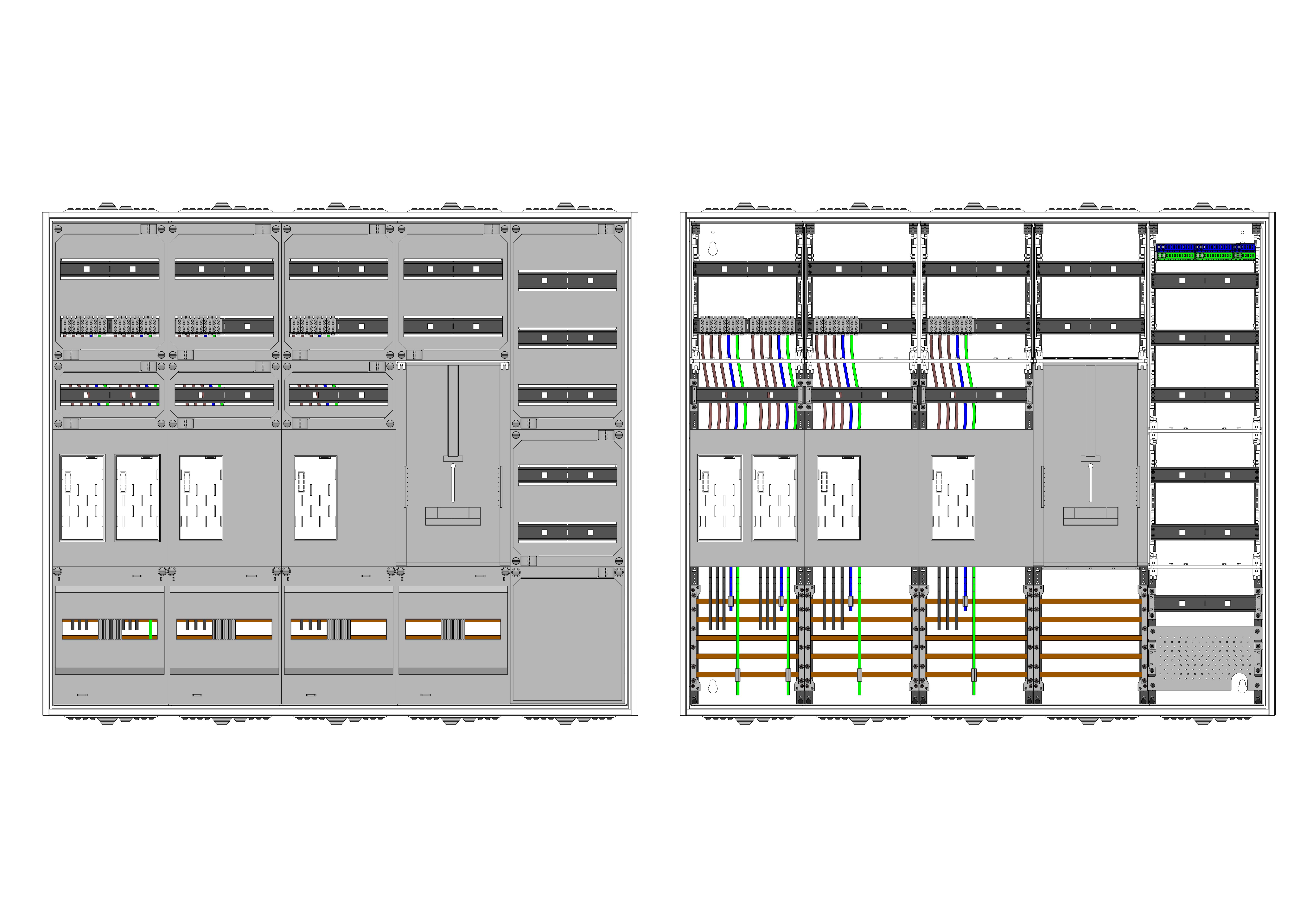AEZ52-230-074, eHZ-Zählerverteilung nach VDE 0603, DIN43870, 4100:2019-04 für den Innenbereich für Wandbefestigung AP/UP, Fabr. Alphatec, BxHxT [mm] = 1300x1100x230, Schutzklasse II, IP54, RAL 7035, Bestehend aus: Gehäuse, Doppeltür mit Schwenkhebel für Profilhalbzylinder, Flansche SF45 (oben) und SF41 (unten) und Berührungsschutzabdeckungen, aufgebaut wie folgt: 4x Zählerplatz, 1x TSG-Platte, 5x Hutschienen in Verteilerfeld 1 (12TE), 1x APZ in Verteilerfeld 1, geeignet für TSG-Hutschienenmontage: nein, inkl. Querverdrahtung, komplett zusammengebaut und verdrahtet gemäß VNB.0001