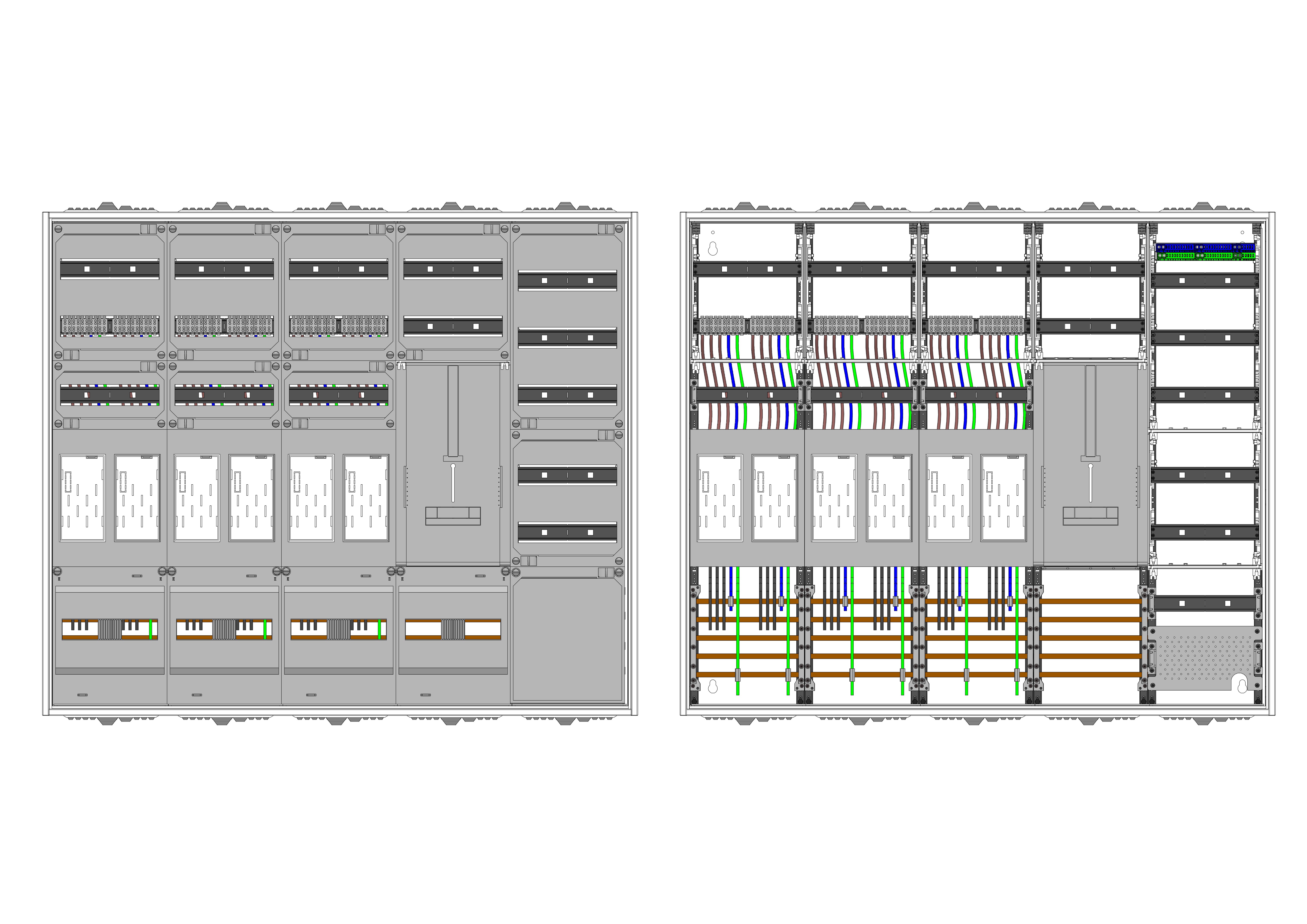AEZ52-230-078, eHZ-Zählerverteilung nach VDE 0603, DIN43870, 4100:2019-04 für den Innenbereich für Wandbefestigung AP/UP, Fabr. Alphatec, BxHxT [mm] = 1300x1100x230, Schutzklasse II, IP54, RAL 7035, Bestehend aus: Gehäuse, Doppeltür mit Schwenkhebel für Profilhalbzylinder, Flansche SF45 (oben) und SF41 (unten) und Berührungsschutzabdeckungen, aufgebaut wie folgt: 6x Zählerplatz, 1x TSG-Platte, 5x Hutschienen in Verteilerfeld 1 (12TE), 1x APZ in Verteilerfeld 1, geeignet für TSG-Hutschienenmontage: nein, inkl. Querverdrahtung, komplett zusammengebaut und verdrahtet gemäß VNB.0001