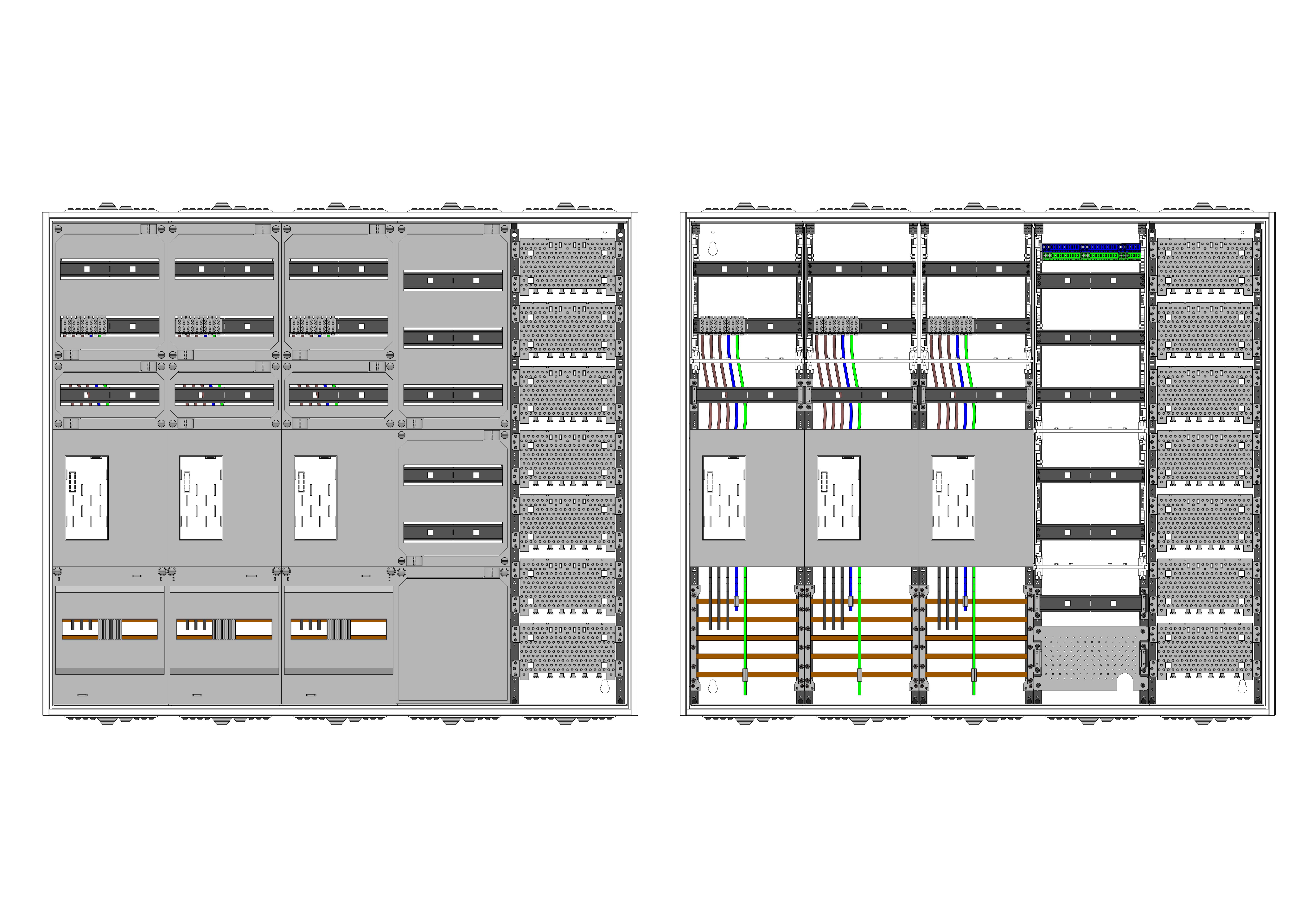 AEZ52-230-090, eHZ-Zählerverteilung nach VDE 0603, DIN43870, 4100:2019-04 für den Innenbereich für Wandbefestigung AP/UP, Fabr. Alphatec, BxHxT [mm] = 1300x1100x230, Schutzklasse II, IP54, RAL 7035, Bestehend aus: Gehäuse, Doppeltür mit Schwenkhebel für Profilhalbzylinder, Flansche SF45 (oben) und SF41 (unten) und Berührungsschutzabdeckungen, aufgebaut wie folgt: 3x Zählerplatz, 5x Hutschienen in Verteilerfeld 1 (12TE), 1x APZ in Verteilerfeld 1, 1x Medienfeld 1 Feld breit, komplett zusammengebaut und verdrahtet gemäß VNB.0001