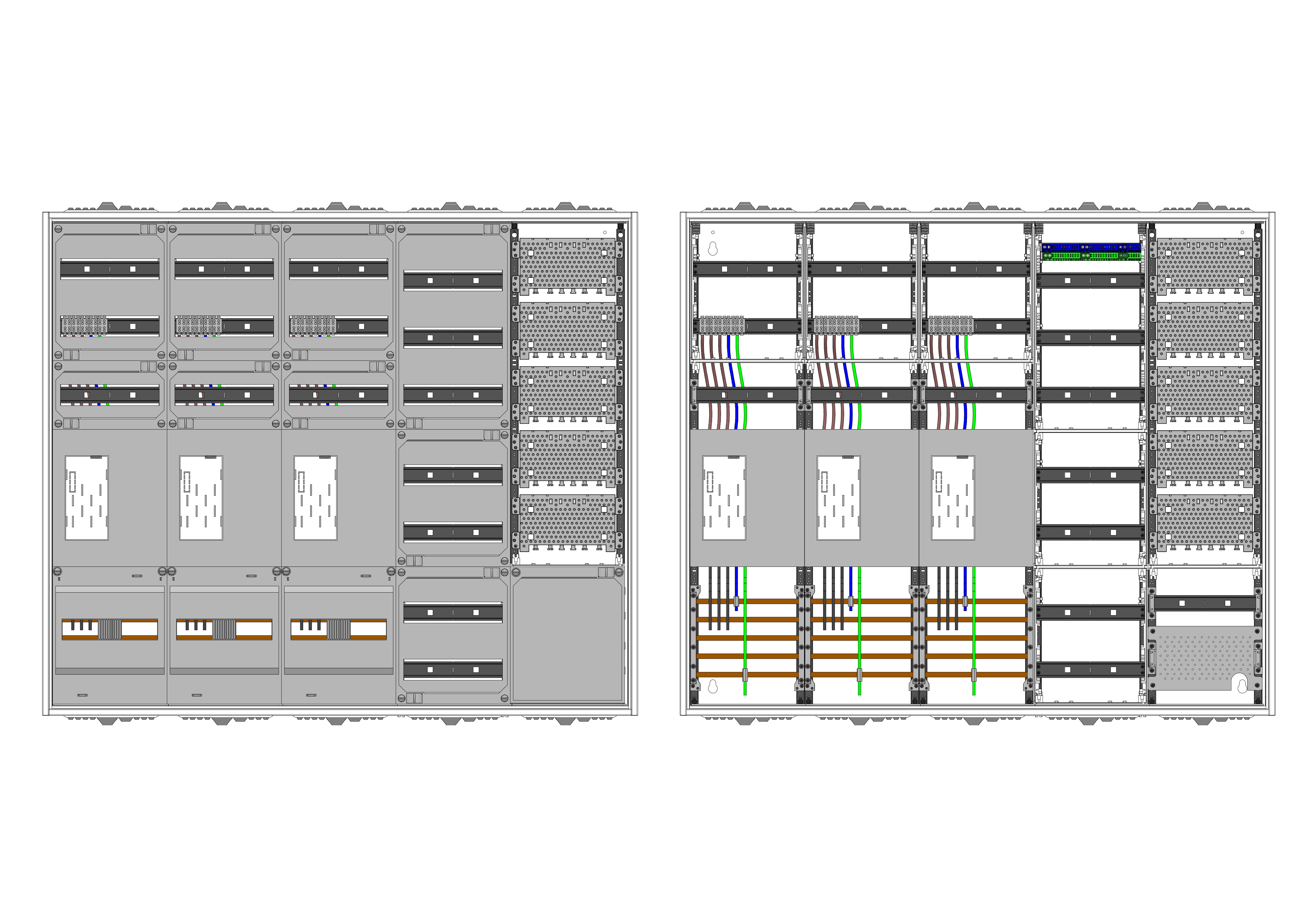 AEZ52-230-091, eHZ-Zählerverteilung nach VDE 0603, DIN43870, 4100:2019-04 für den Innenbereich für Wandbefestigung AP/UP, Fabr. Alphatec, BxHxT [mm] = 1300x1100x230, Schutzklasse II, IP54, RAL 7035, Bestehend aus: Gehäuse, Doppeltür mit Schwenkhebel für Profilhalbzylinder, Flansche SF45 (oben) und SF41 (unten) und Berührungsschutzabdeckungen, aufgebaut wie folgt: 3x Zählerplatz, 7x Hutschienen in Verteilerfeld 1 (12TE), 1x Medienfeld 1 Feld breit inkl. APZ, komplett zusammengebaut und verdrahtet gemäß VNB.0001