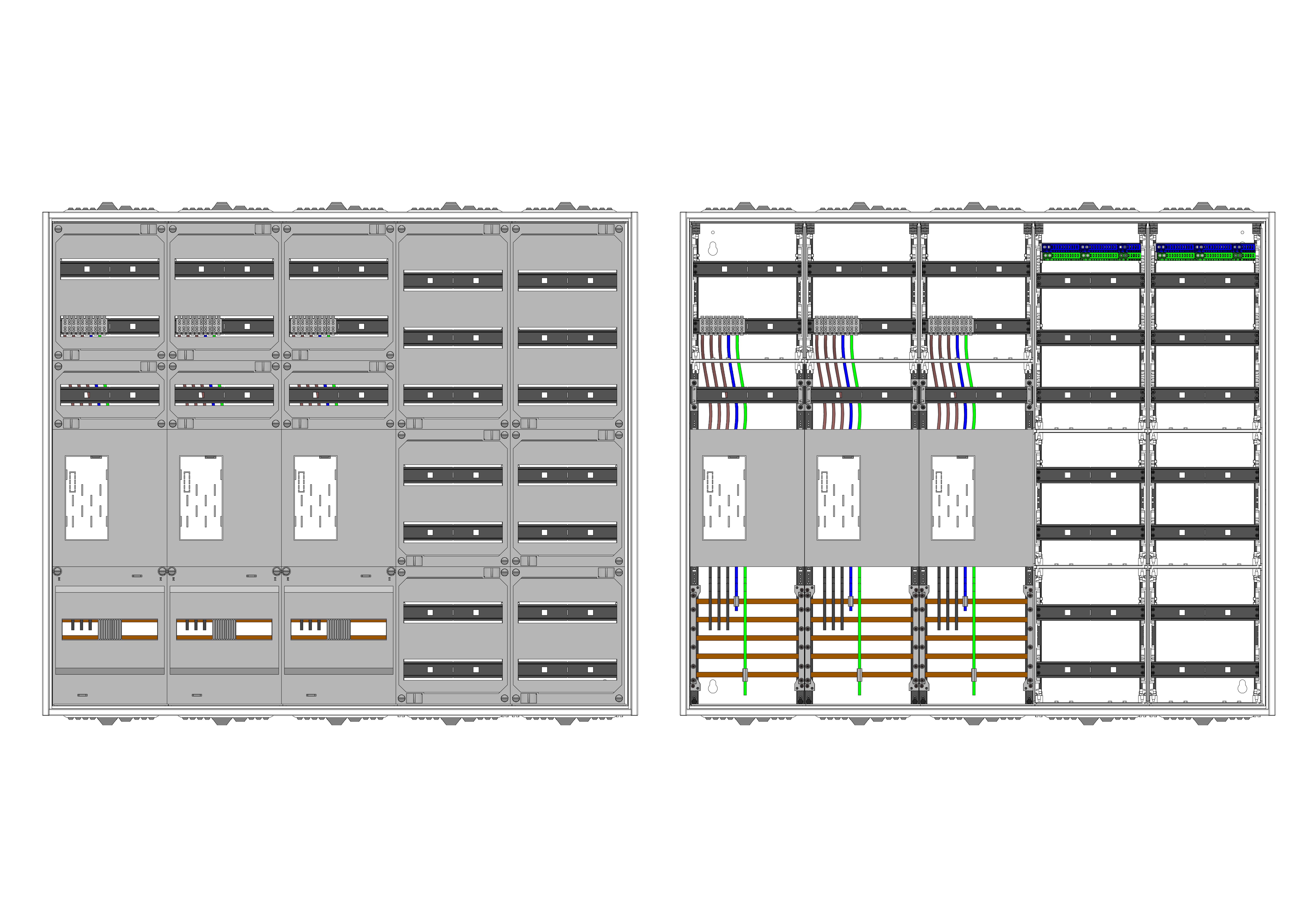 AEZ52-230-094, eHZ-Zählerverteilung nach VDE 0603, DIN43870, 4100:2019-04 für den Innenbereich für Wandbefestigung AP/UP, Fabr. Alphatec, BxHxT [mm] = 1300x1100x230, Schutzklasse II, IP54, RAL 7035, Bestehend aus: Gehäuse, Doppeltür mit Schwenkhebel für Profilhalbzylinder, Flansche SF45 (oben) und SF41 (unten) und Berührungsschutzabdeckungen, aufgebaut wie folgt: 3x Zählerplatz, 7x Hutschienen in Verteilerfeld 1 (12TE), 7x Hutschienen in Verteilerfeld 2 (12TE), komplett zusammengebaut und verdrahtet gemäß VNB.0001