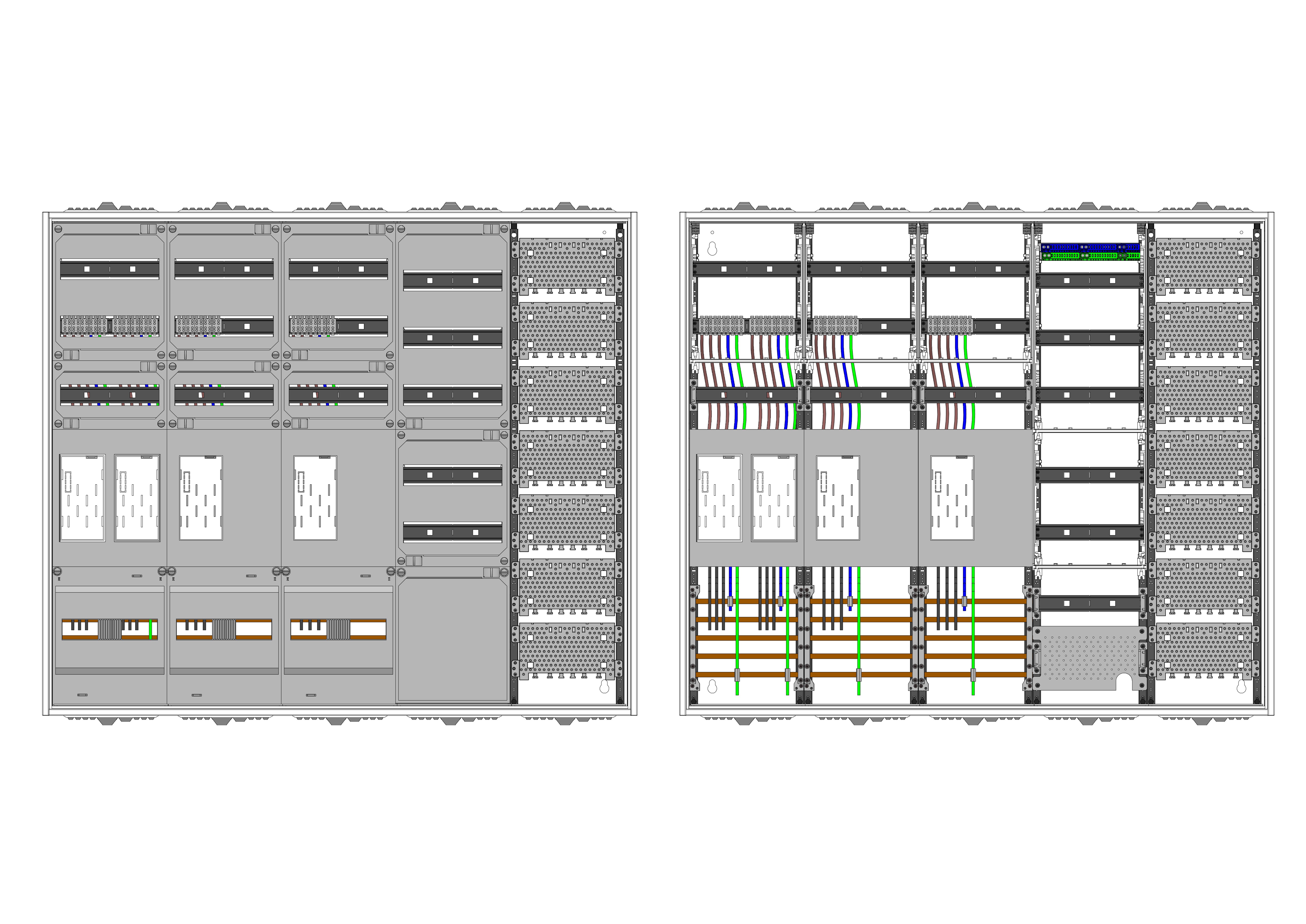 AEZ52-230-095, eHZ-Zählerverteilung nach VDE 0603, DIN43870, 4100:2019-04 für den Innenbereich für Wandbefestigung AP/UP, Fabr. Alphatec, BxHxT [mm] = 1300x1100x230, Schutzklasse II, IP54, RAL 7035, Bestehend aus: Gehäuse, Doppeltür mit Schwenkhebel für Profilhalbzylinder, Flansche SF45 (oben) und SF41 (unten) und Berührungsschutzabdeckungen, aufgebaut wie folgt: 4x Zählerplatz, 5x Hutschienen in Verteilerfeld 1 (12TE), 1x APZ in Verteilerfeld 1, 1x Medienfeld 1 Feld breit, komplett zusammengebaut und verdrahtet gemäß VNB.0001