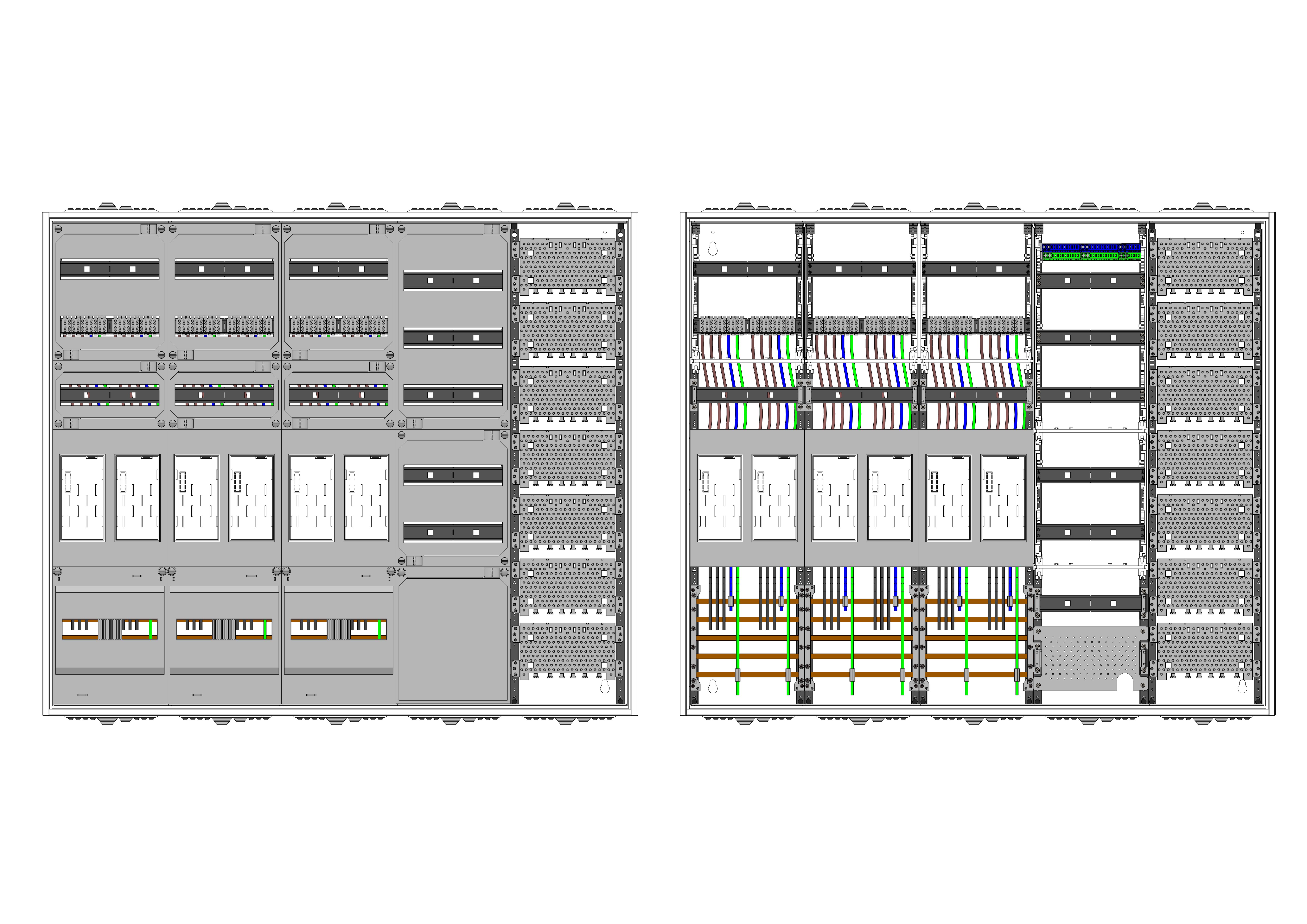 AEZ52-230-105, eHZ-Zählerverteilung nach VDE 0603, DIN43870, 4100:2019-04 für den Innenbereich für Wandbefestigung AP/UP, Fabr. Alphatec, BxHxT [mm] = 1300x1100x230, Schutzklasse II, IP54, RAL 7035, Bestehend aus: Gehäuse, Doppeltür mit Schwenkhebel für Profilhalbzylinder, Flansche SF45 (oben) und SF41 (unten) und Berührungsschutzabdeckungen, aufgebaut wie folgt: 6x Zählerplatz, 5x Hutschienen in Verteilerfeld 1 (12TE), 1x APZ in Verteilerfeld 1, 1x Medienfeld 1 Feld breit, komplett zusammengebaut und verdrahtet gemäß VNB.0001