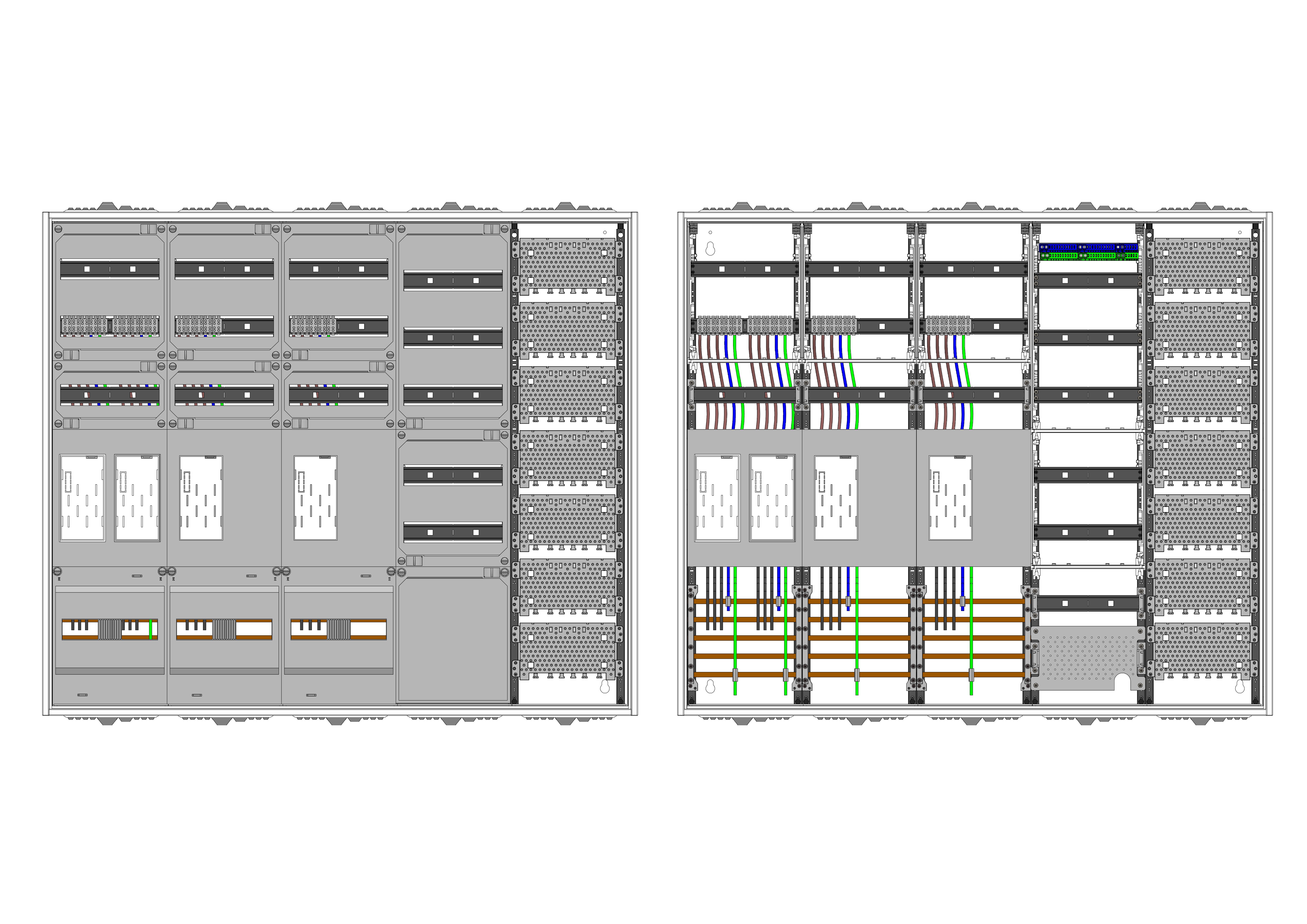 AEZ52-230-115, eHZ-Zählerverteilung nach VDE 0603, DIN43870, 4100:2019-04 für den Innenbereich für Wandbefestigung AP/UP, Fabr. Alphatec, BxHxT [mm] = 1300x1100x230, Schutzklasse II, IP54, RAL 7035, Bestehend aus: Gehäuse, Doppeltür mit Schwenkhebel für Profilhalbzylinder, Flansche SF45 (oben) und SF41 (unten) und Berührungsschutzabdeckungen, aufgebaut wie folgt: 4x Zählerplatz, 1x TSG-Platte, 5x Hutschienen in Verteilerfeld 1 (12TE), 1x APZ in Verteilerfeld 1, 1x Medienfeld 1 Feld breit, geeignet für TSG-Hutschienenmontage: ja, inkl. Querverdrahtung, komplett zusammengebaut und verdrahtet gemäß VNB.0001