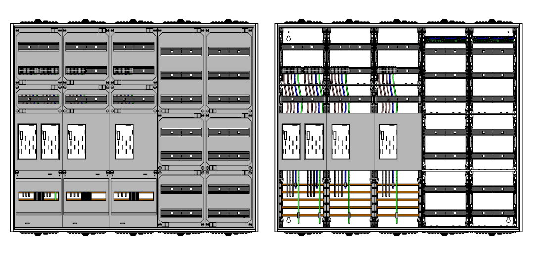 AEZ52-230-119, eHZ-Zählerverteilung nach VDE 0603, DIN43870, 4100:2019-04 für den Innenbereich für Wandbefestigung AP/UP, Fabr. Alphatec, BxHxT [mm] = 1300x1100x230, Schutzklasse II, IP54, RAL 7035, Bestehend aus: Gehäuse, Doppeltür mit Schwenkhebel für Profilhalbzylinder, Flansche SF45 (oben) und SF41 (unten) und Berührungsschutzabdeckungen, aufgebaut wie folgt: 4x Zählerplatz, 1x TSG-Platte, 7x Hutschienen in Verteilerfeld 1 (12TE), 7x Hutschienen in Verteilerfeld 2 (12TE), geeignet für TSG-Hutschienenmontage: ja, inkl. Querverdrahtung, komplett zusammengebaut und verdrahtet gemäß VNB.0001