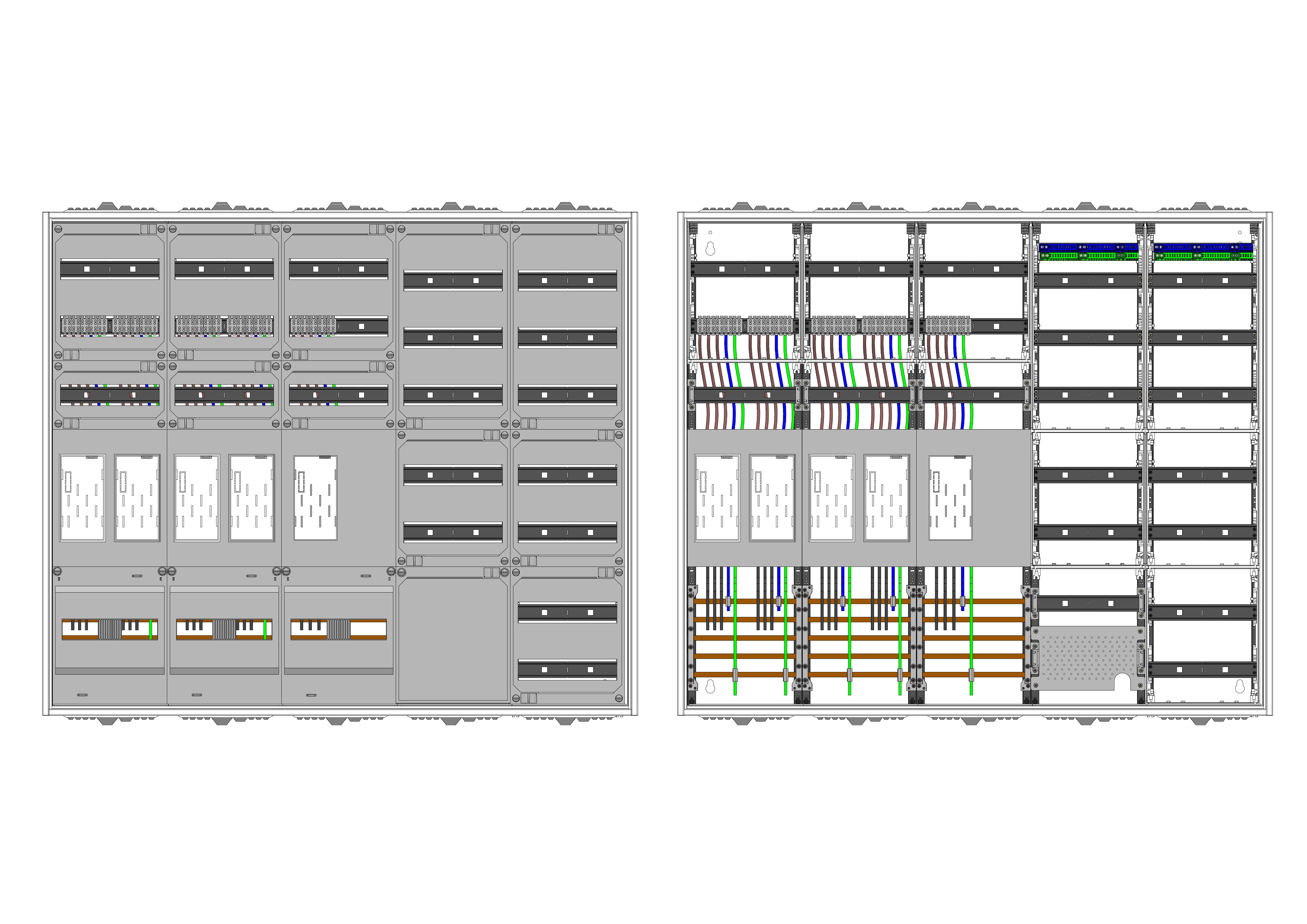 AEZ52-230-123, eHZ-Zählerverteilung nach VDE 0603, DIN43870, 4100:2019-04 für den Innenbereich für Wandbefestigung AP/UP, Fabr. Alphatec, BxHxT [mm] = 1300x1100x230, Schutzklasse II, IP54, RAL 7035, Bestehend aus: Gehäuse, Doppeltür mit Schwenkhebel für Profilhalbzylinder, Flansche SF45 (oben) und SF41 (unten) und Berührungsschutzabdeckungen, aufgebaut wie folgt: 5x Zählerplatz, 1x TSG-Platte, 5x Hutschienen in Verteilerfeld 1 (12TE), 1x APZ in Verteilerfeld 1, 7x Hutschienen in Verteilerfeld 2 (12TE), geeignet für TSG-Hutschienenmontage: ja, inkl. Querverdrahtung, komplett zusammengebaut und verdrahtet gemäß VNB.0001