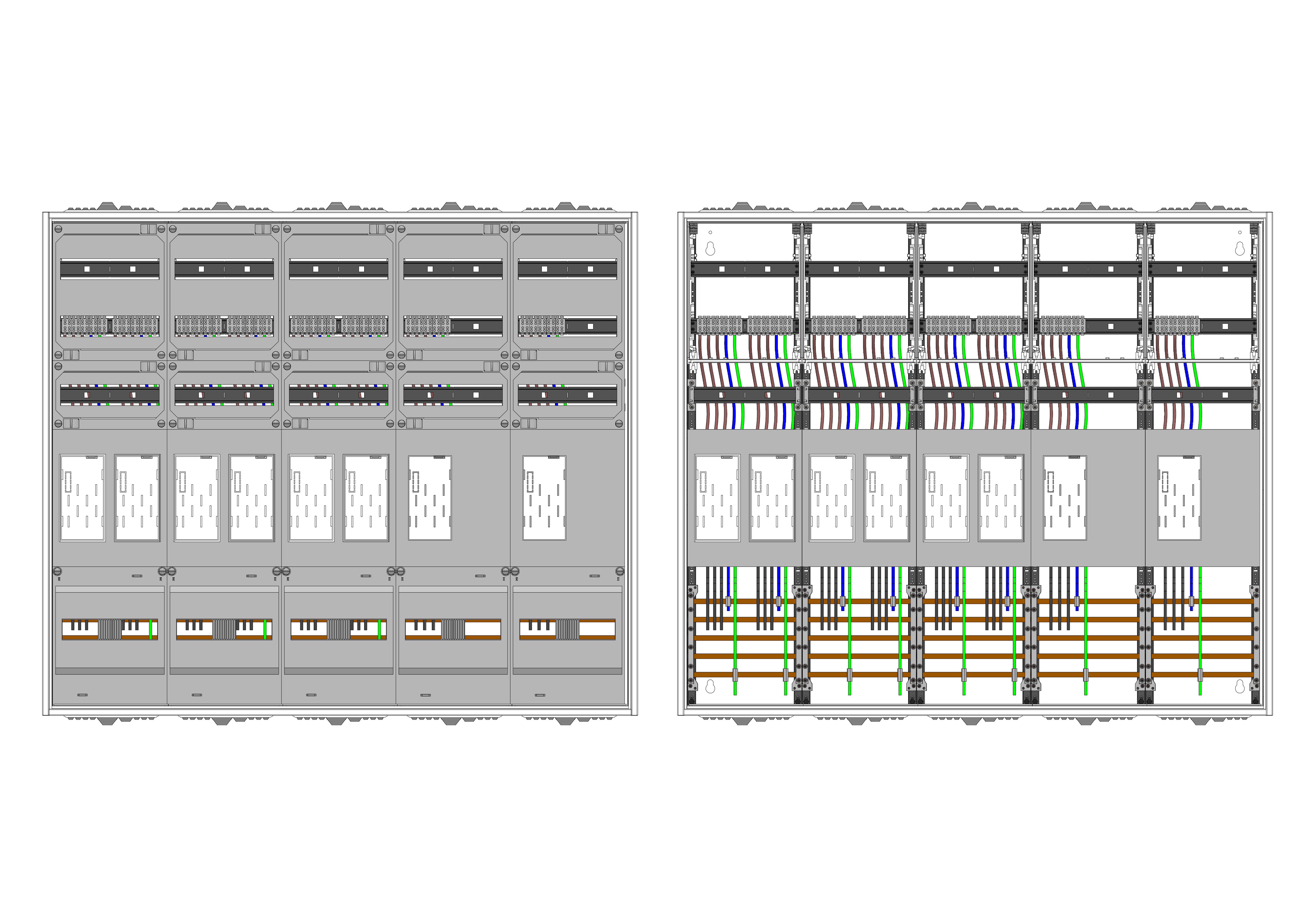 AEZ52-230-133, eHZ-Zählerverteilung nach VDE 0603, DIN43870, 4100:2019-04 für den Innenbereich für Wandbefestigung AP/UP, Fabr. Alphatec, BxHxT [mm] = 1300x1100x230, Schutzklasse II, IP54, RAL 7035, Bestehend aus: Gehäuse, Doppeltür mit Schwenkhebel für Profilhalbzylinder, Flansche SF45 (oben) und SF41 (unten) und Berührungsschutzabdeckungen, aufgebaut wie folgt: 8x Zählerplatz, komplett zusammengebaut und verdrahtet gemäß VNB.0001