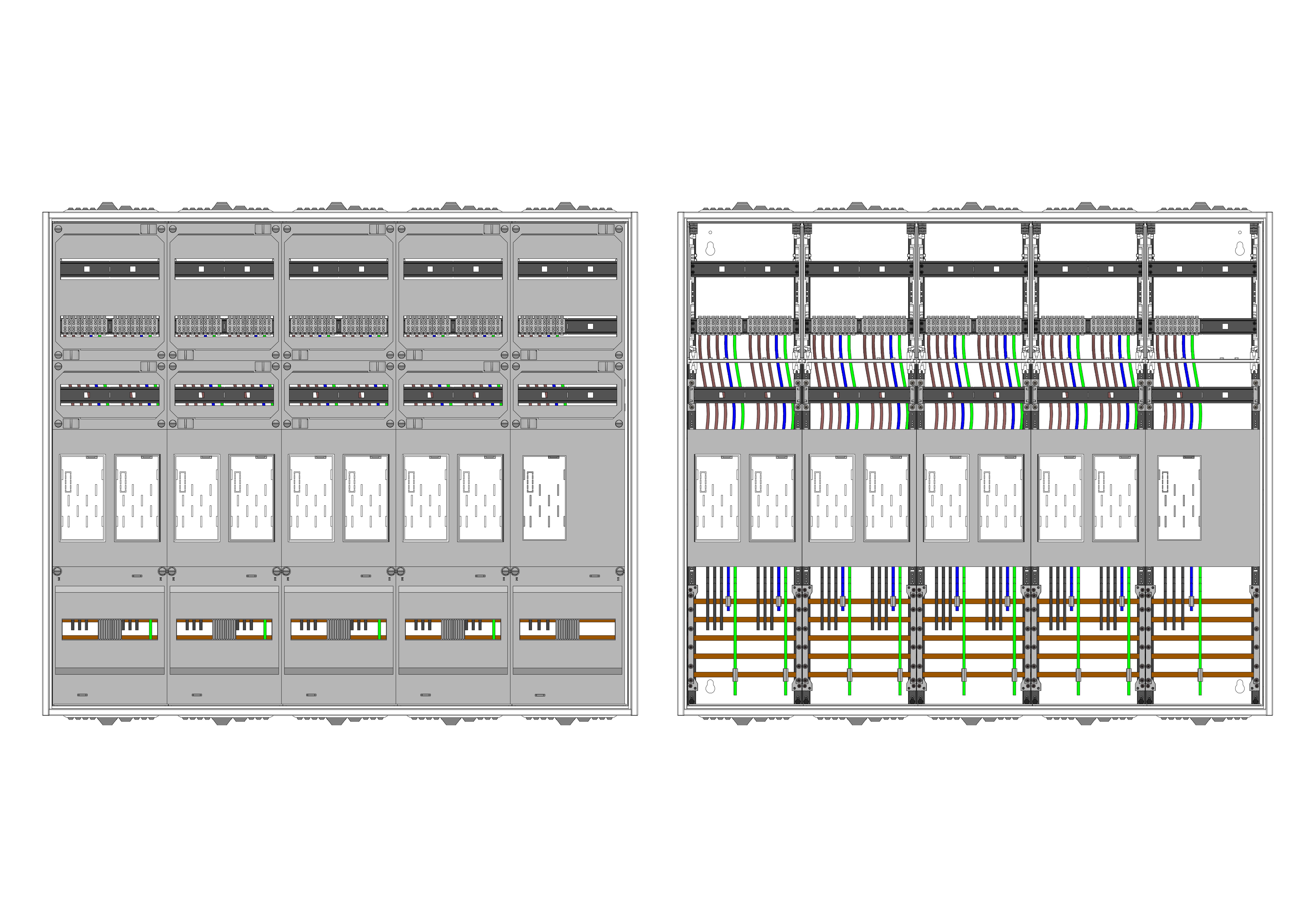 AEZ52-230-134, eHZ-Zählerverteilung nach VDE 0603, DIN43870, 4100:2019-04 für den Innenbereich für Wandbefestigung AP/UP, Fabr. Alphatec, BxHxT [mm] = 1300x1100x230, Schutzklasse II, IP54, RAL 7035, Bestehend aus: Gehäuse, Doppeltür mit Schwenkhebel für Profilhalbzylinder, Flansche SF45 (oben) und SF41 (unten) und Berührungsschutzabdeckungen, aufgebaut wie folgt: 9x Zählerplatz, komplett zusammengebaut und verdrahtet gemäß VNB.0001