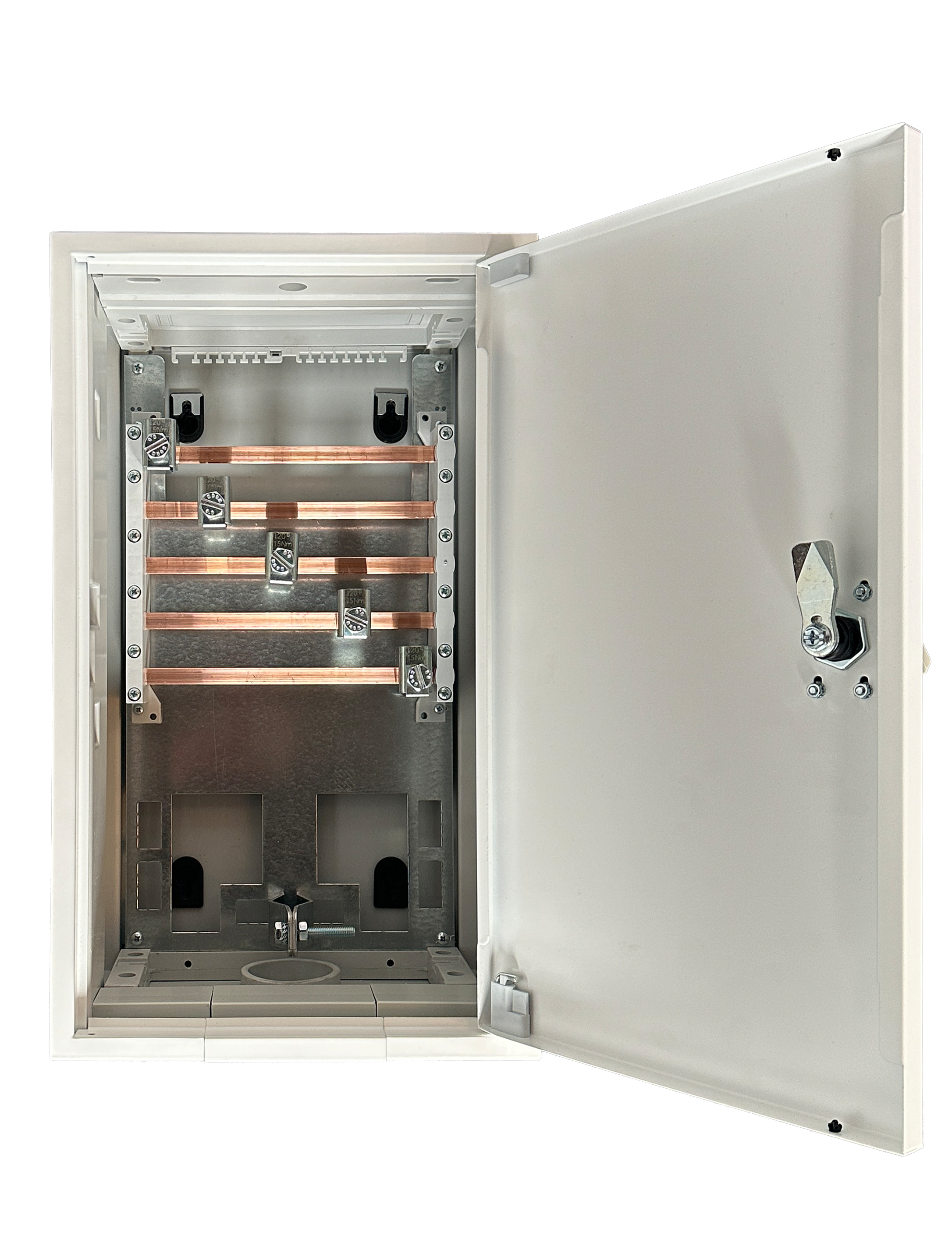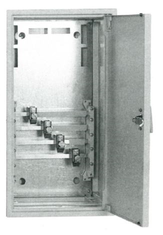 ASK120-230 Anschlusskasten mit Schienensystem und Anschlussklemmen bis 120 mm² Gehäuse: Ausführung in Stahlblech schutzisoliert, Farbe: RAL 7035 lichtgrau, Größe: BxHxT = 300x550x230 mm, Tür plombierbar, Anbaumöglichkeit an Schrank: seitlich: Kombi links: Kabeleinführung von unten, Kabelabafang oben Kombi rechts: Kabeleinführung von oben, Kabelabfang unten Anschlussklemme bis 120 mm² 5-polig, Sammelschienensystem 250A 5-polig, CU-Verbindungssatz zum Anreihen an Schrank Anmerkung: kein nachträglicher Anbau möglich. Bei der Bestellung des Gehäuses mitbestellen.